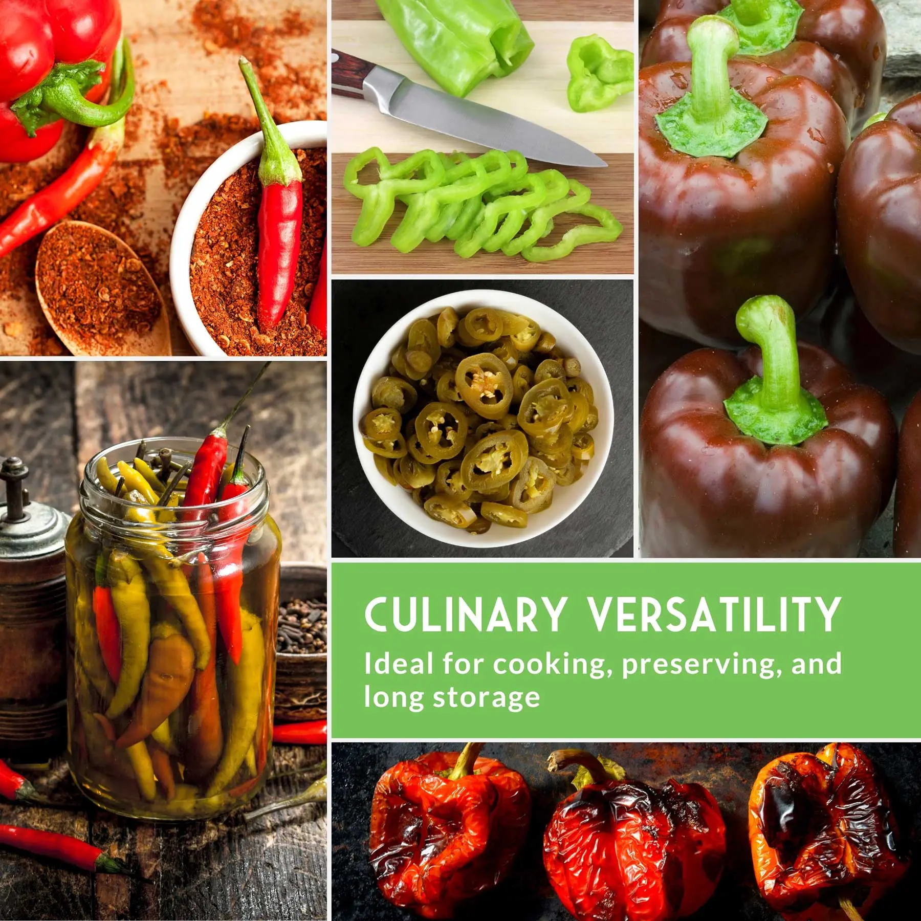 Our seeds are non-GMO and heirloom. Perfect for home planting. Jalapeño, Cayenne, Serrano, Marconi Red, Cubanelle, Big Red, Chocolate Beauty, Cubanelle. Each variety offers unique flavors. Jalapeño, Cayenne, Serrano, Marconi Red, Cubanelle, Big Red, Chocolate Beauty. All for your culinary needs. 🌿
