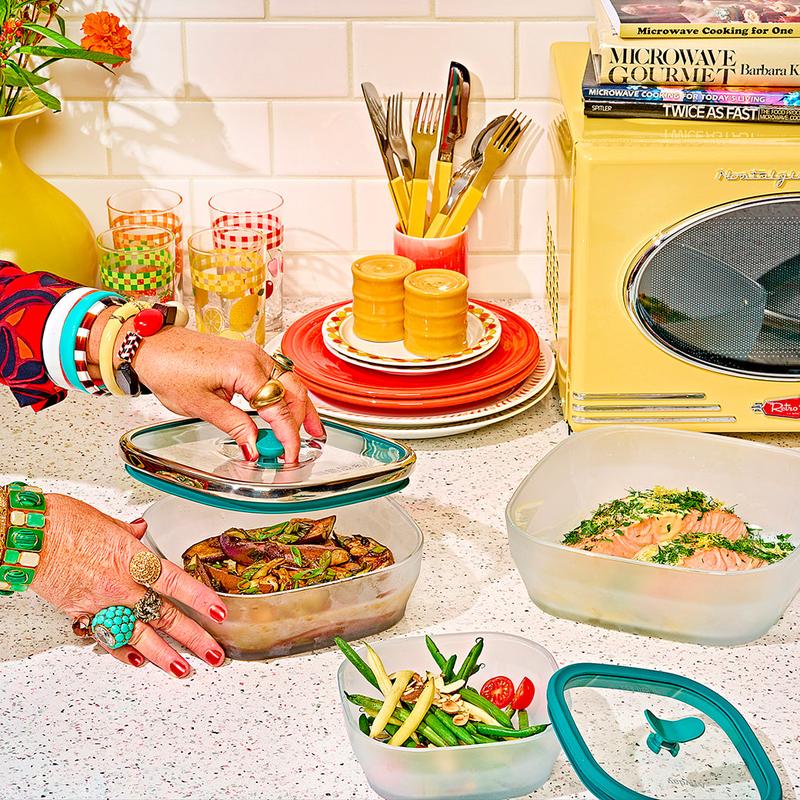 The stackable, lay-flat knobs save space in cabinets and refrigerators. Pull the knob up to vent while microwaving and press down for airtight storage. Keep your kitchen organized and efficient with this innovative design.