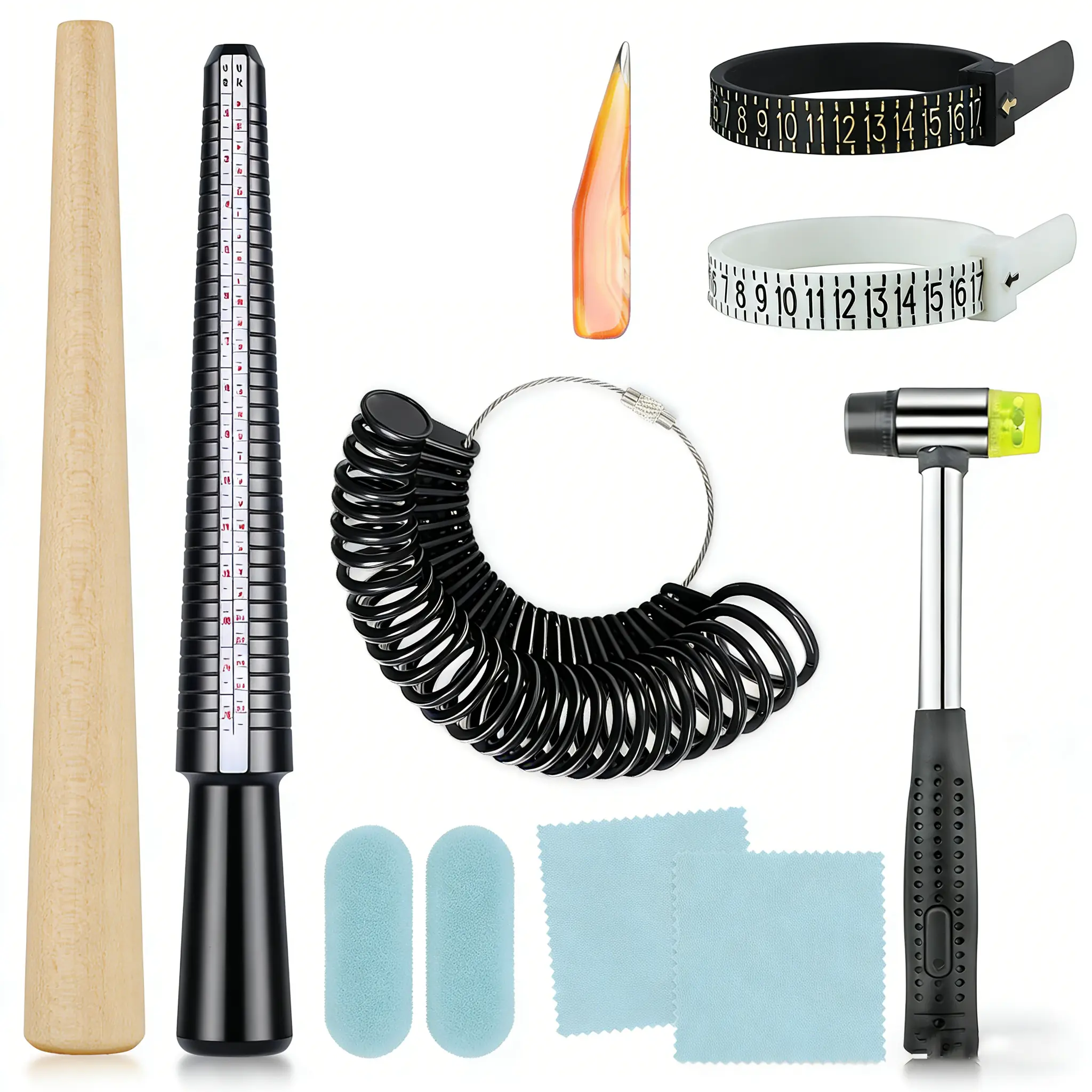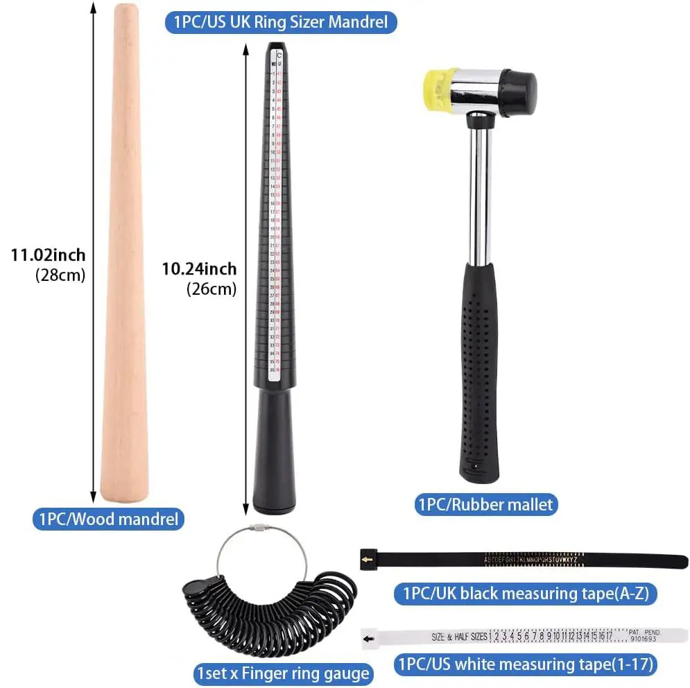 This kit includes 8 essential tools: ring mandrel, ring sizer gauge, hammer, and polishing tools. Perfect for creating and sizing rings. Ideal for DIY jewelry enthusiasts. 🛠️