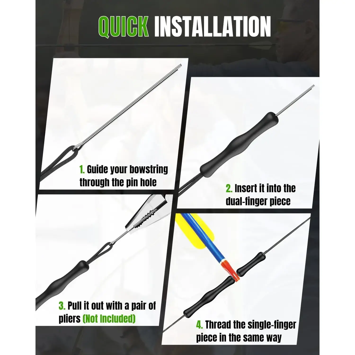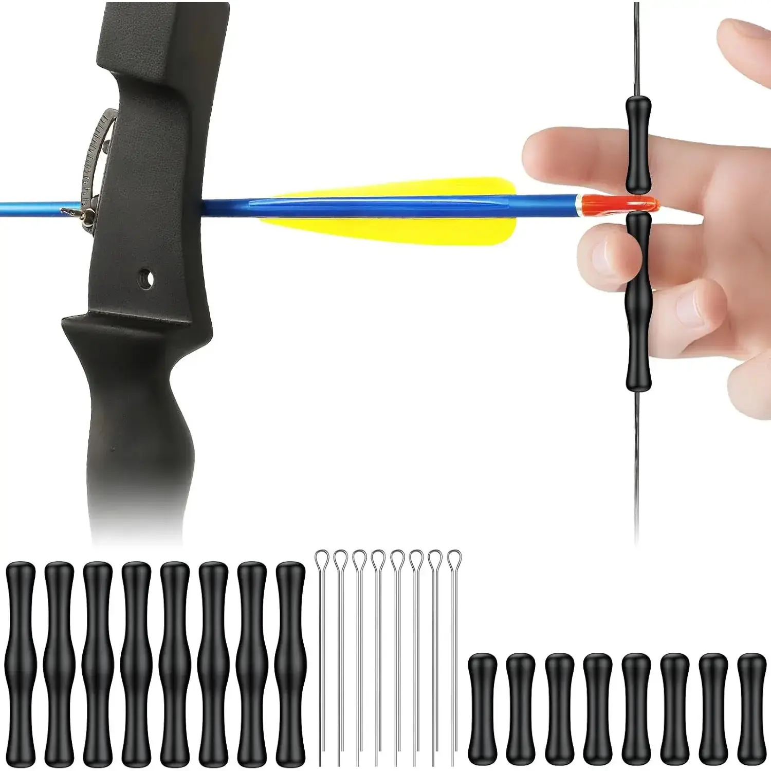 ·Quick Installation: Effortless setup with the included metal threading pin – simply guide your bowstring through the pin hole, insert it into the finger guard, then withdraw the pin. Your bowstring finger protectors are ready for action in seconds
