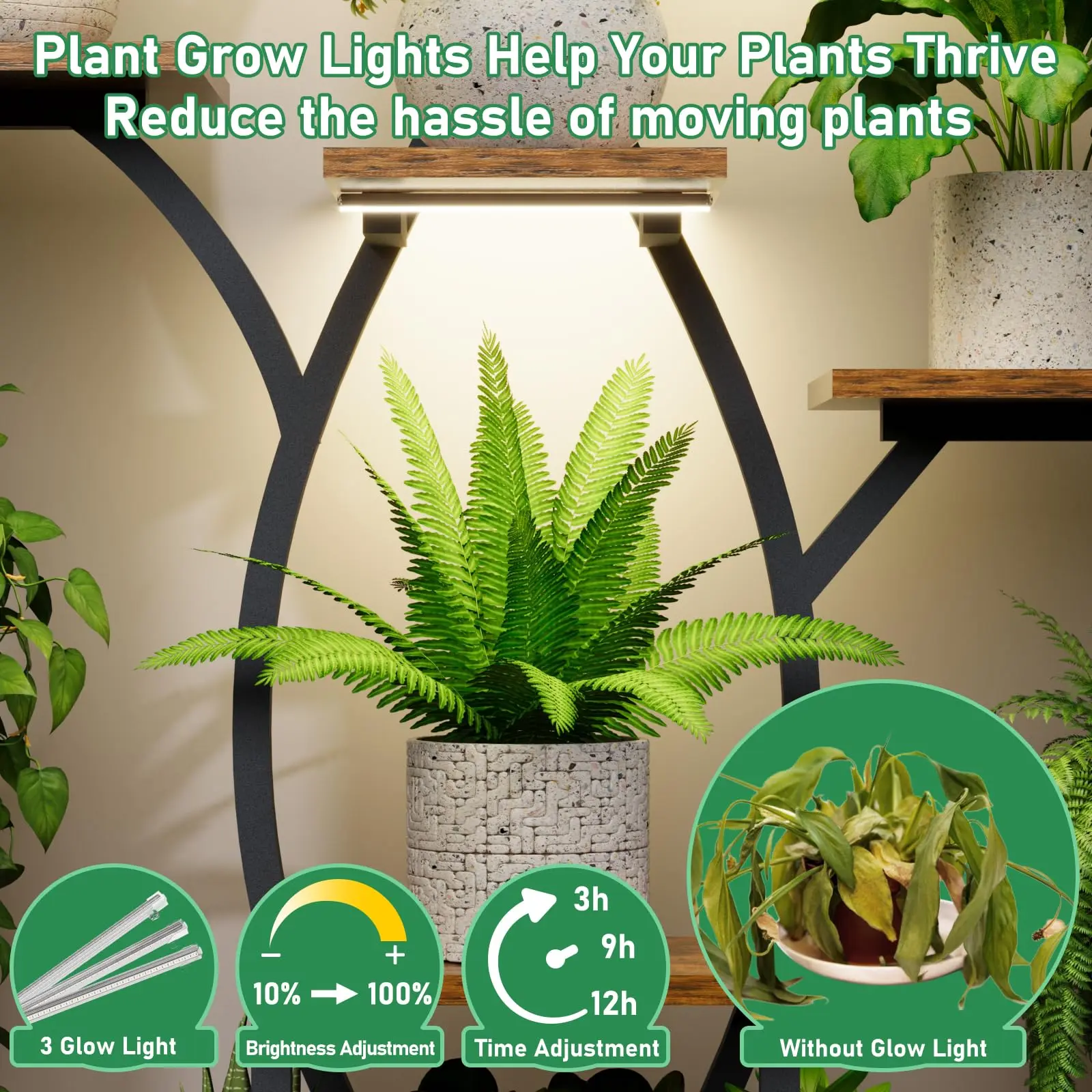 ·[Plant Stand With Grow light]:Equipped with different light intensity and time adjustable settings, let your indoor plants grow better without worrying about their growth. Lighten your load, no need to move your plants to get sunlight.