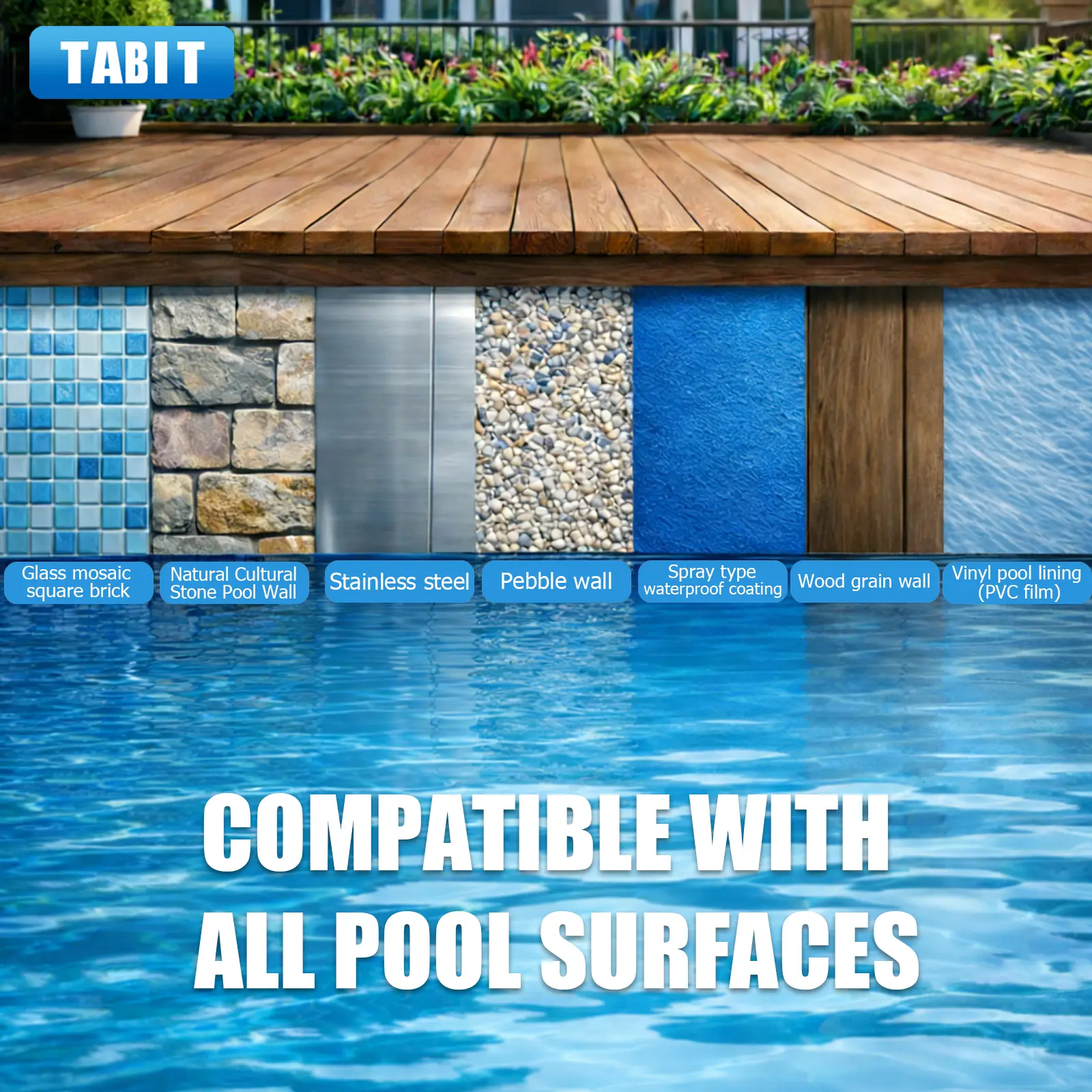 Whether you have a vinyl-lined pool, concrete spa, fiberglass hot tub, or saltwater system—TABIT works seamlessly without scratching or damaging surfaces . No need to buy specialized products—one tab fits all your water features!