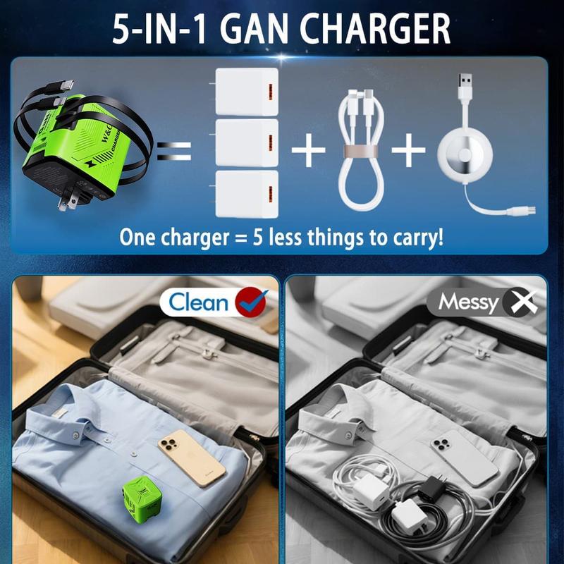 Charge at lightning speed with the W&O F5 5-in-1 Portable GaN Fast Charger. Compatible with 120W GaN tech, it charges 3X faster than standard chargers. Perfect for iPhone 15, Samsung, gaming gear, and more. Say goodbye to cable chaos and bulky adapters. This charger is your ultimate power solution.