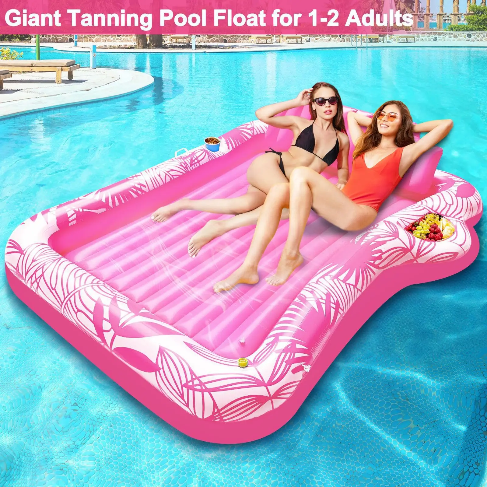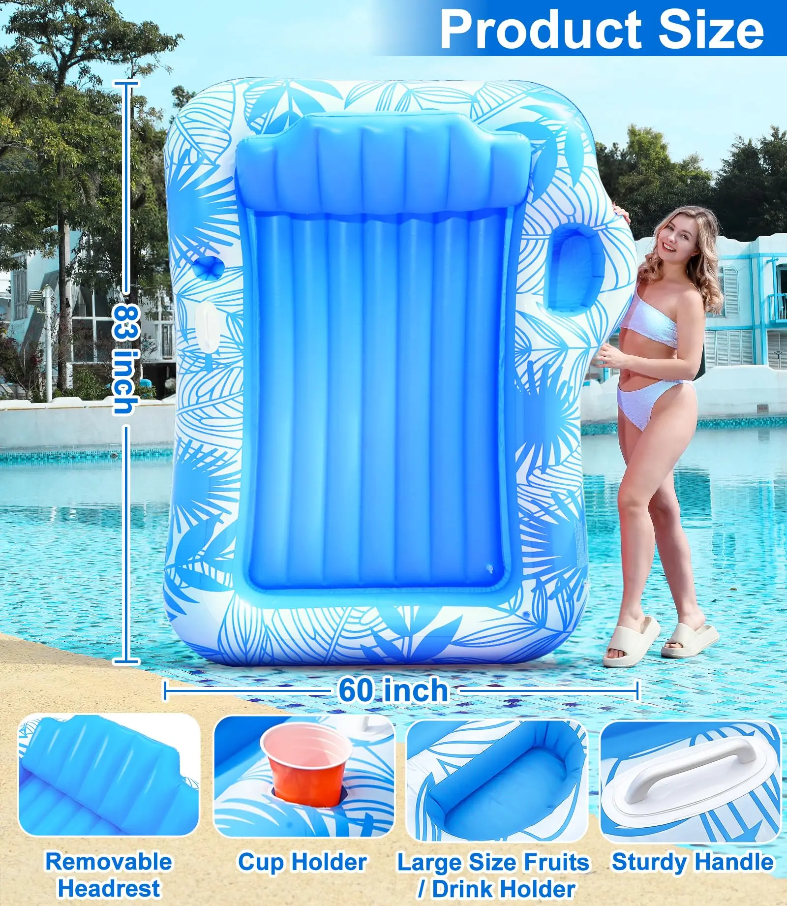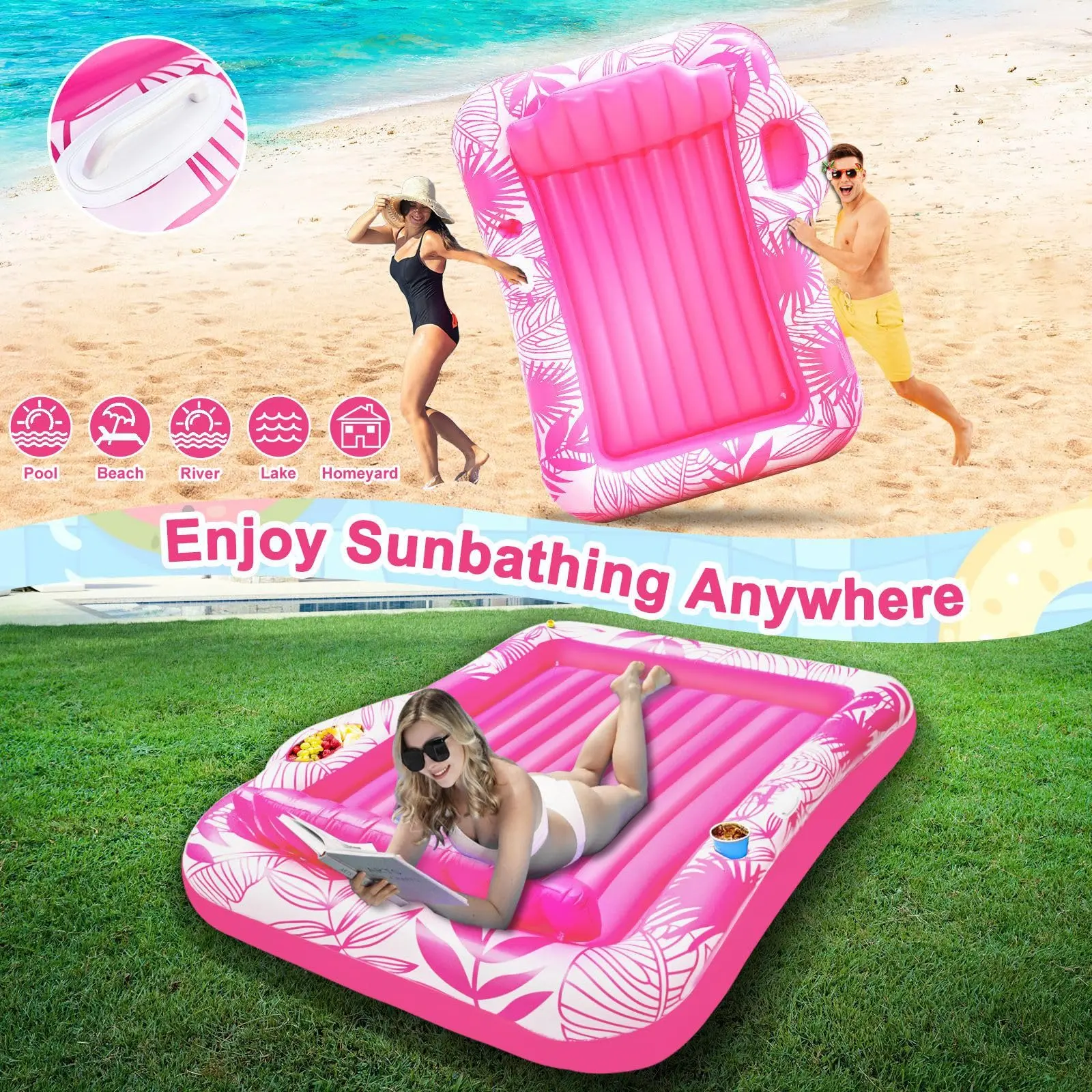 Inflatable Tanning Pool Lounger is measured 83" x 60" x 7.8" (L x W x H), spacious for two to sunbathe together—unwind in the sunshine with family, friends, or loved one (up to 440 pounds). Features a vibrant tropical plant design, brightening your outdoor space and creating a tropical getaway feel.