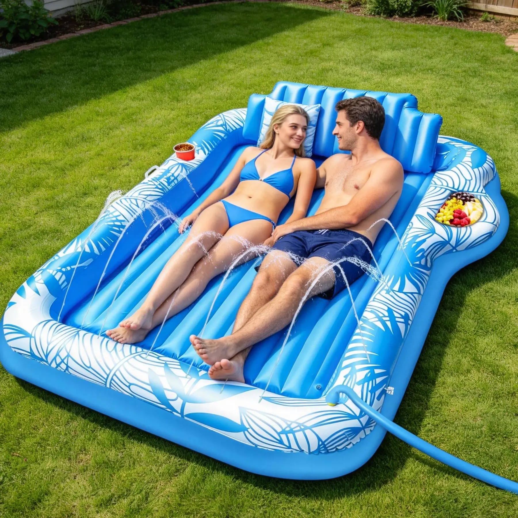 The inflatable tanning pool float is built-in water spray holes, with semi-circular layout and adjustable spray height, creating a customizable, cooling water mist around you under the summer sun. Just fill the tanning lounger with water to turn it into a tanning pool, perfect for lounging and soaking up the sun.