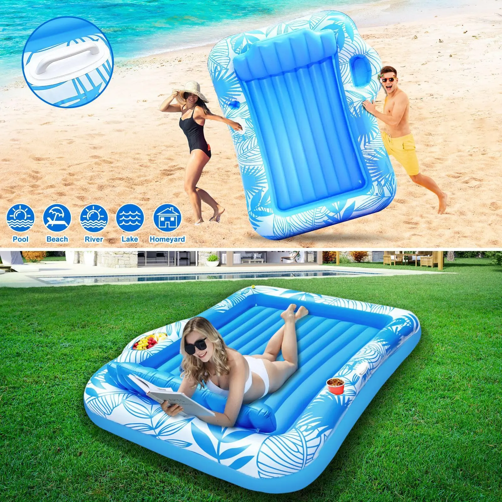 This tanning float offers high comfort and safety. Designed with a cup holders, a food holder, a detachable backrest, and a ribbed air cushion base providing comfort support for neck and back. Inflatable design and side handles make it portable, instantly transform outdoor space into a relaxing summer retreat.
