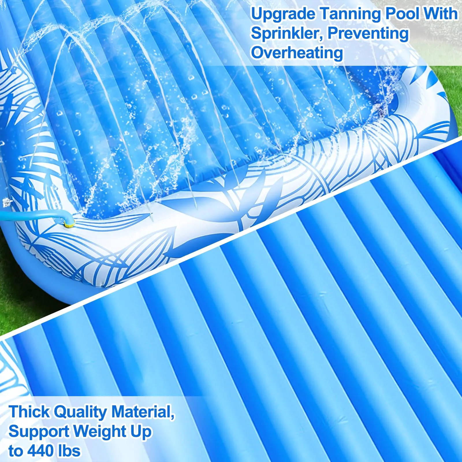 Made from 0.23 mm thick PVC material, this tanning pool lounger is tear-resistant and built to last. Sprinkler pool is easy to inflate and deflate, featuring two double-lock inflation ports to prevent leaks, delivering comfort and cooling summer after summer.