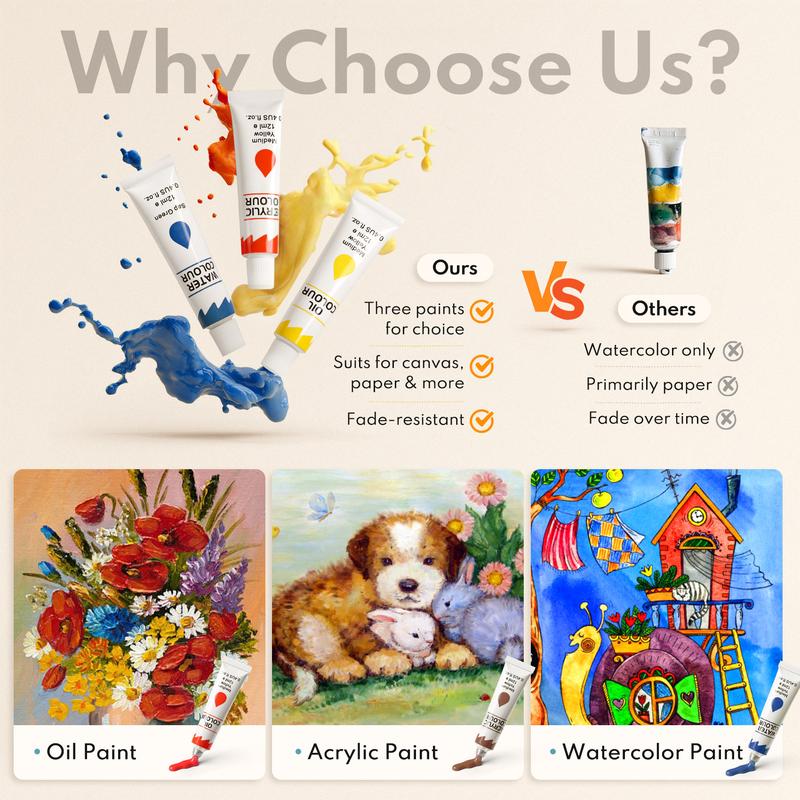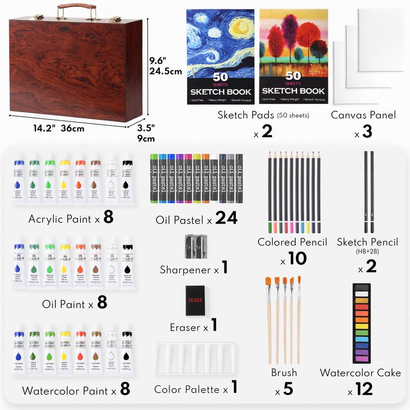 This all-in-one art kit is perfect for kids and adults! It includes 8 acrylic paints, 8 watercolor paints, 8 creamy oil paints, 24 vibrant oil pastels, 12 watercolor cakes, 10 rich colored pencils, 2 smooth sketch pencils (HB+2B), 5 brushes, 3 canvas panels, 2 sketch pads (50 sheets), and essential tools like a color palette, eraser, and sharpener. Everything you need to start your artistic journey immediately!