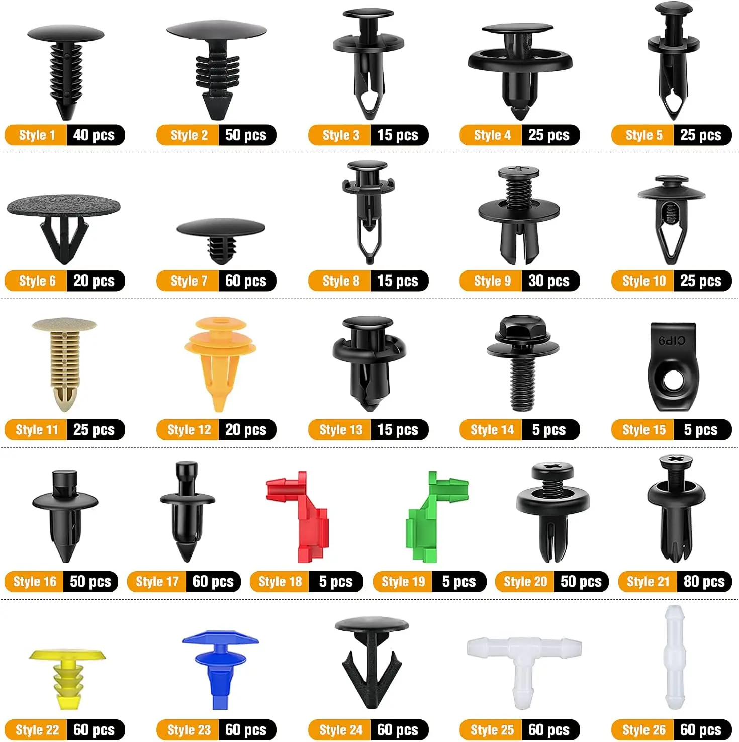Up to 815 pieces of retainer clips in a plastic box, allows to freely DIY your vehicle accessories at anytime you wanted. It is definitely cheaper than going to the auto parts store.