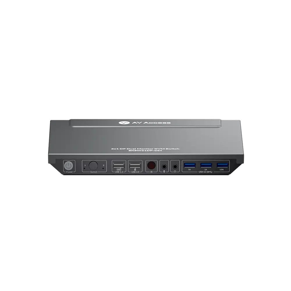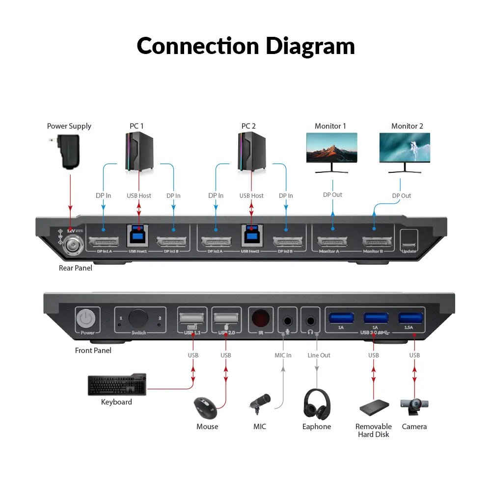 This 8K DP KVM switch is built with 5x USB type-A port (3x USB 3.0, 1x USB 2.0, 1x USB 1.1), so you can control two PCs with only one set of USB devices, like mouse, keyboard, USB flash, 4K webcam, speakerphone, printer, scanner, etc. Stay confident that all peripherals connect to this KVM switch perfectly, as it supports up to 12V/2A power consumption.