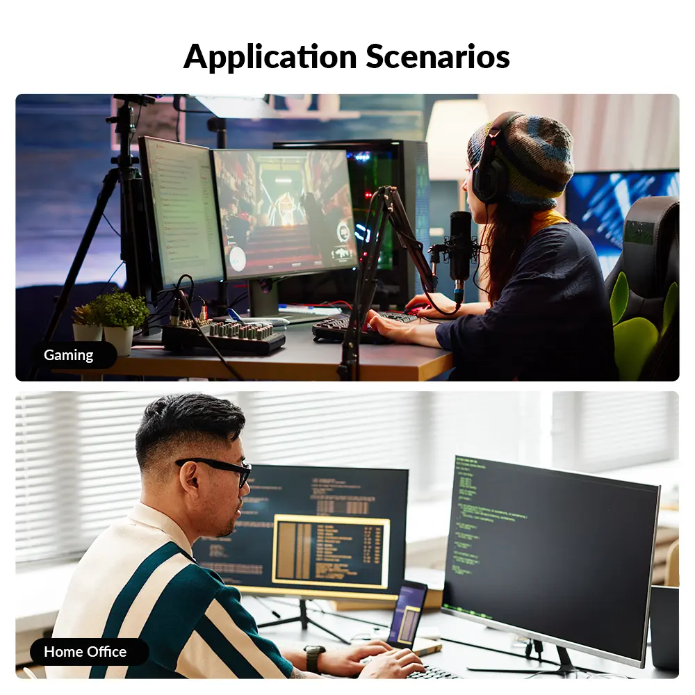 For e-sports games where every second counts, low refresh rate can cause picture lag, greatly affecting the player’s performance. This dual monitor KVM switch supports 4K@165hz/144hz/120hz, 3440×1440@165Hz/144Hz/120Hz, 2560×1440@165hz/144hz/120hz, and 1080P@240hz/165hz/144hz/120hz, ensuring your game sources can be effectively switched. Now it is easier than ever to obtain an unprecedentedly enjoyable gaming experience.