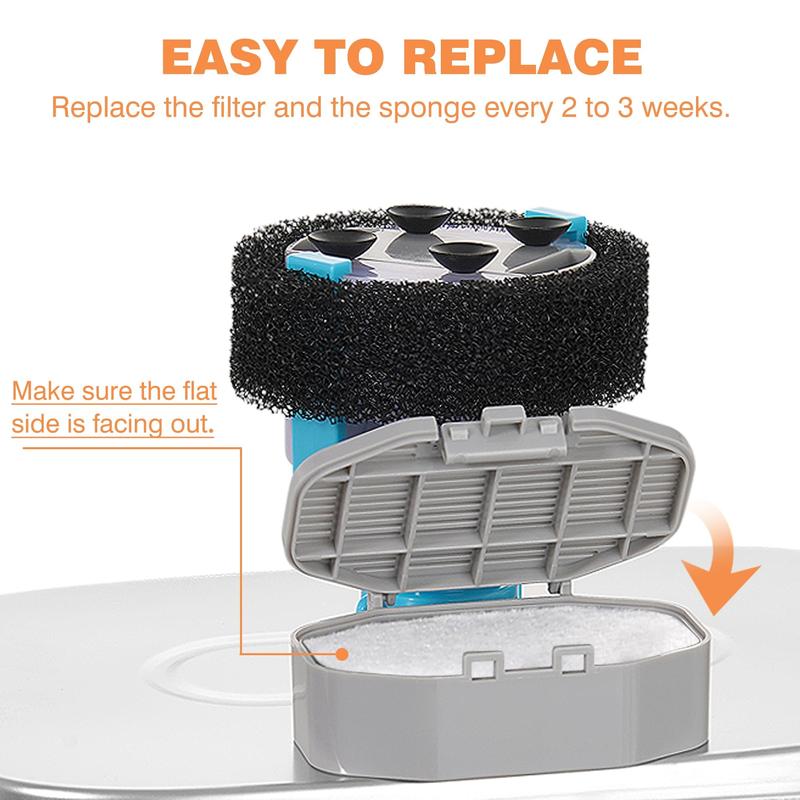·【Quadruple Filtration System】The carbon filter features a triple filtration system that includes a cotton layer, activated carbon, and ion resin, which helps to remove odor, soften water, and improve the taste and quality of your pet's drinking water. Meanwhile, the pre-filter sponge captures pet hair, dirt, and food particles, providing your pet with pure and healthy water.