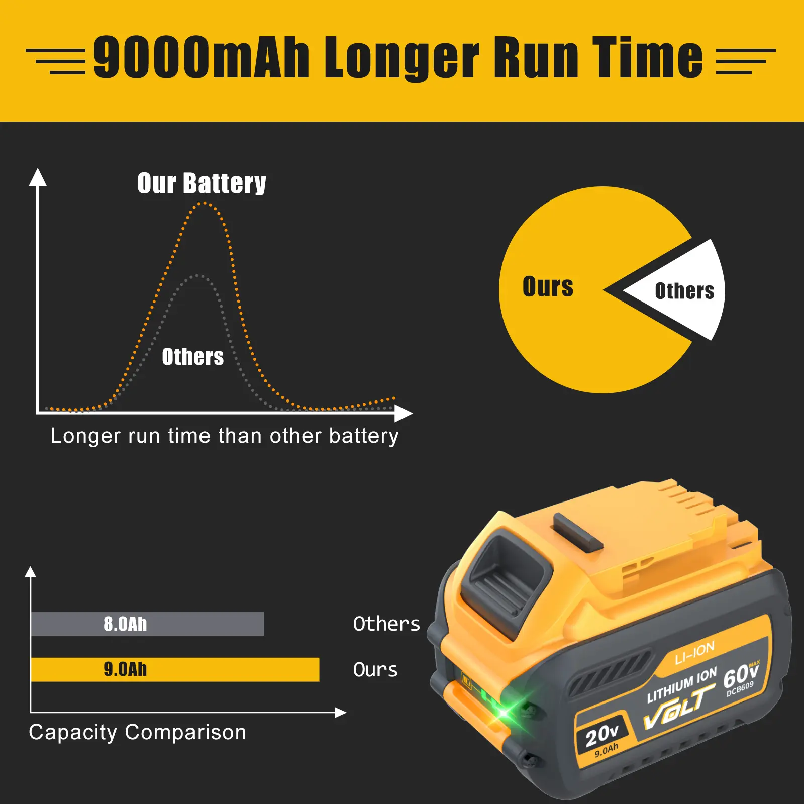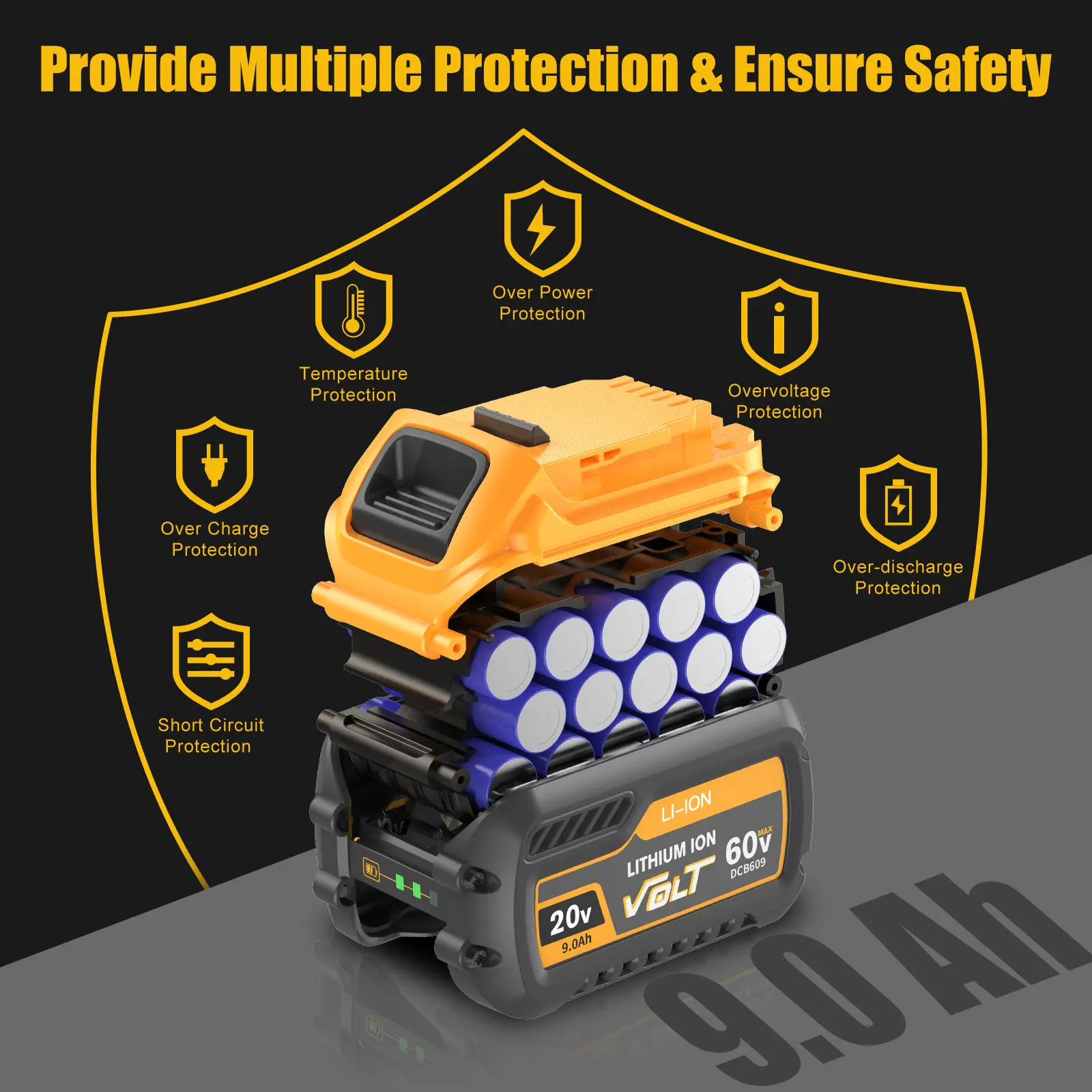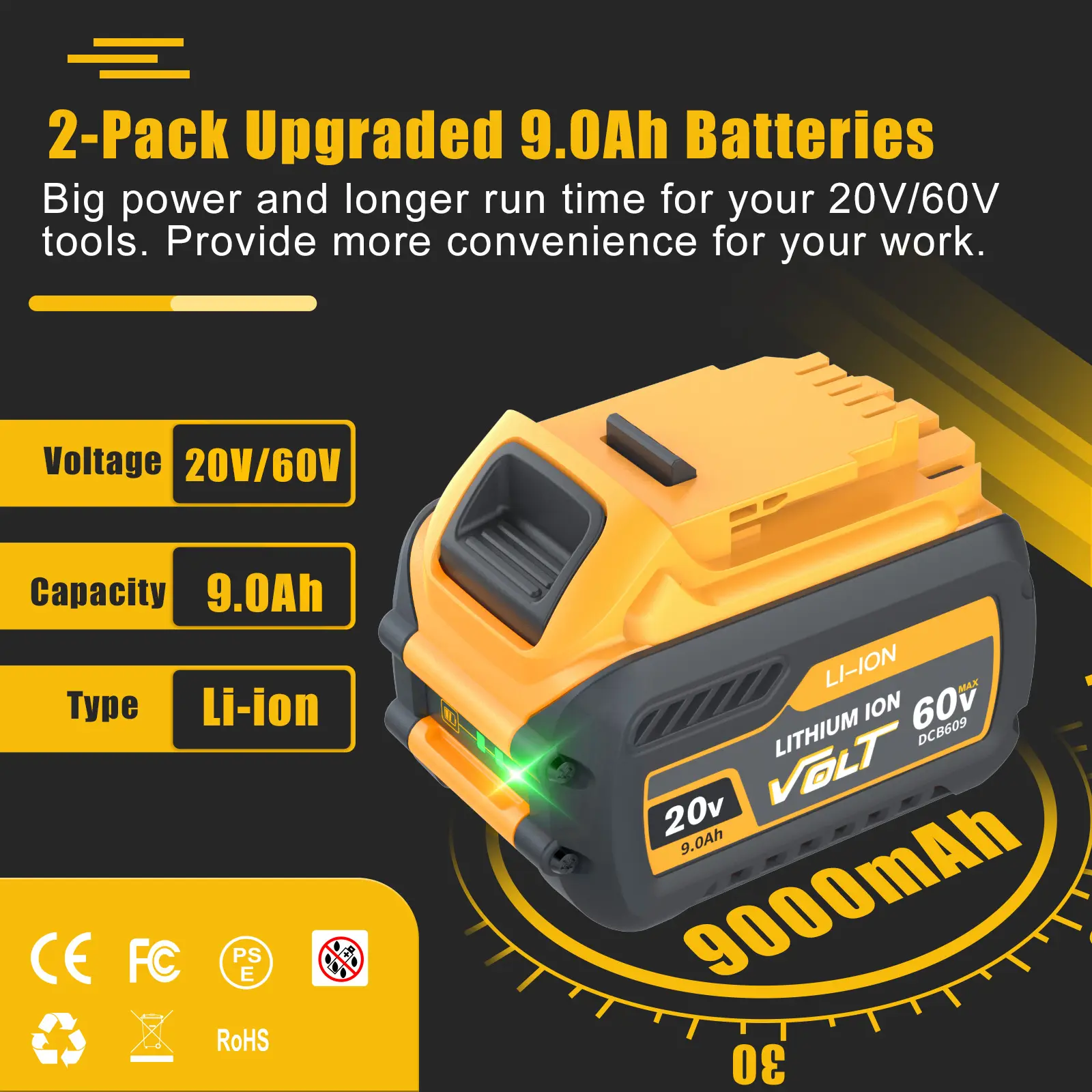 🔋【Perfect compatibility】DCB609 20V 9.0Ah Lithium Ion battery for Dewalt 60V flexvolt battery not only delivers outstanding performance and 3X longer runtime but also features intelligent battery management and professional grade lithium-ion cell for extra durability and an extended life span.