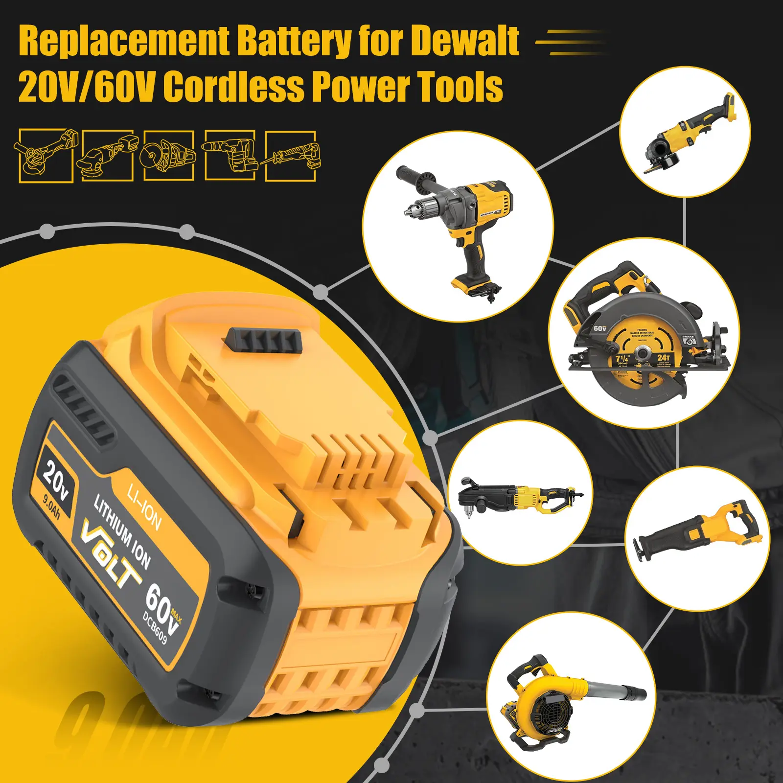 🔋【Perfect compatibility】Replacement Battery for Dewalt 20V MAX battery and 60V MAX battery DCB609, DCB612, DCB206, DCB205, DCB204, DCB203, DCB201, DCB207, DCB209. Compatible with all Dewalt 20V tools. Rechargeable with original Dewalt chargers DCB112 DCB115 DCB118 DCB1102 DCB1104.