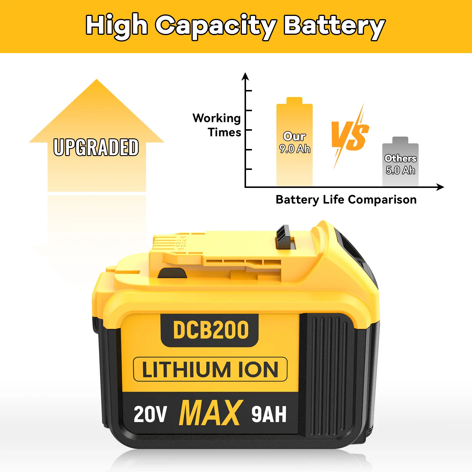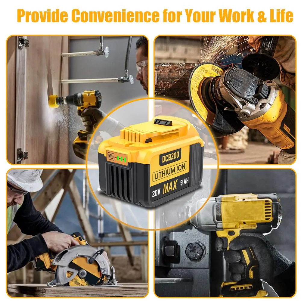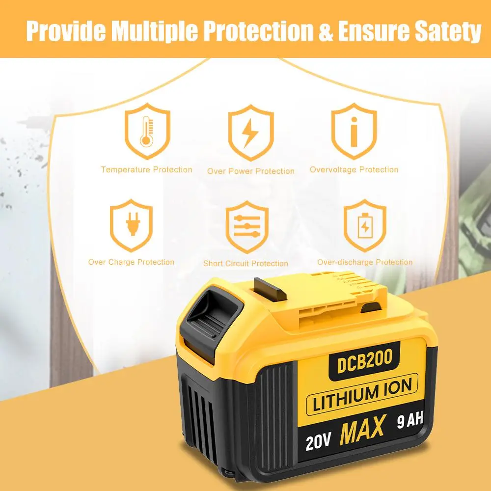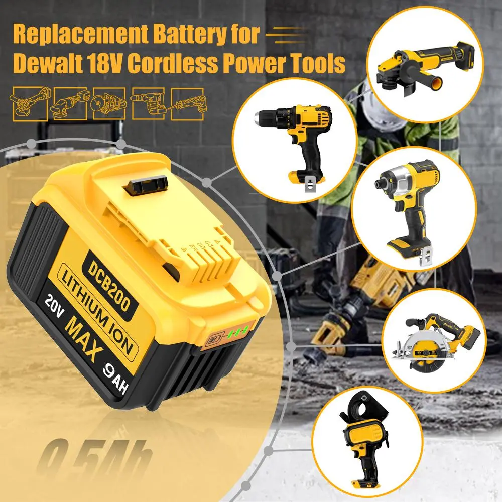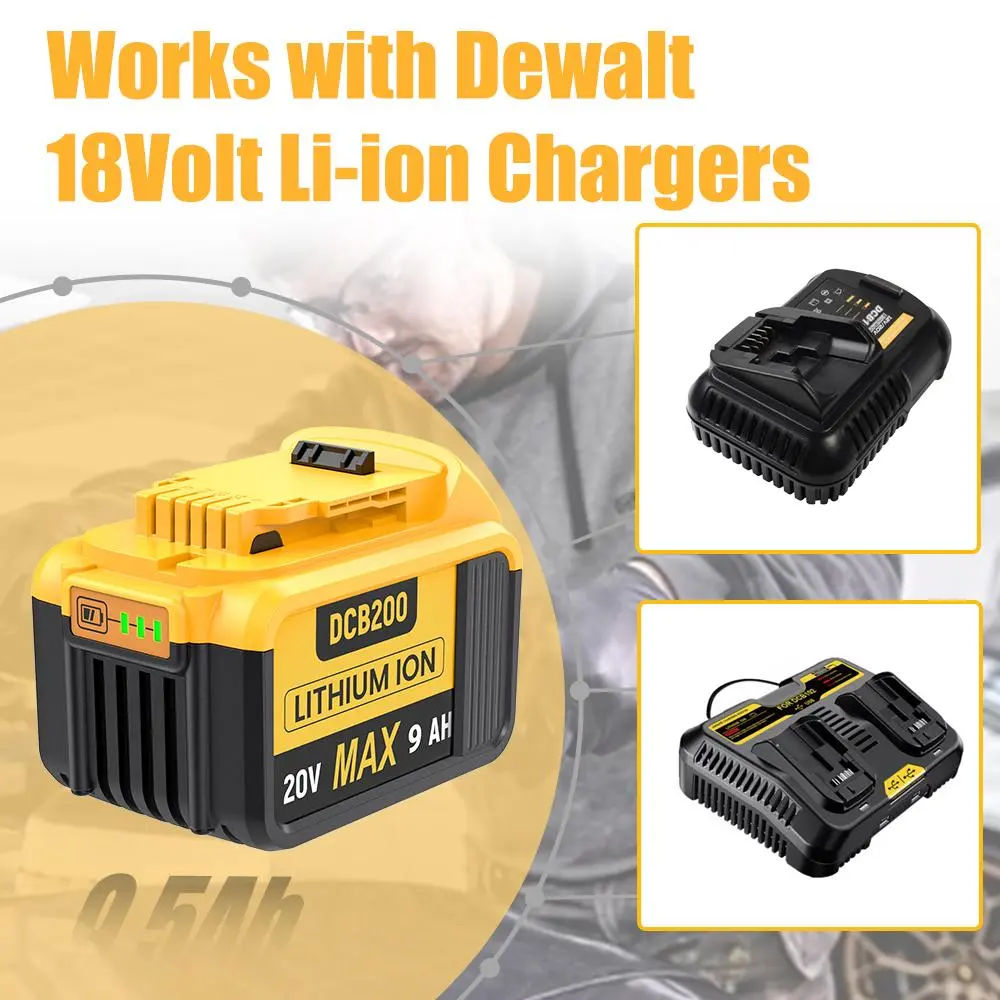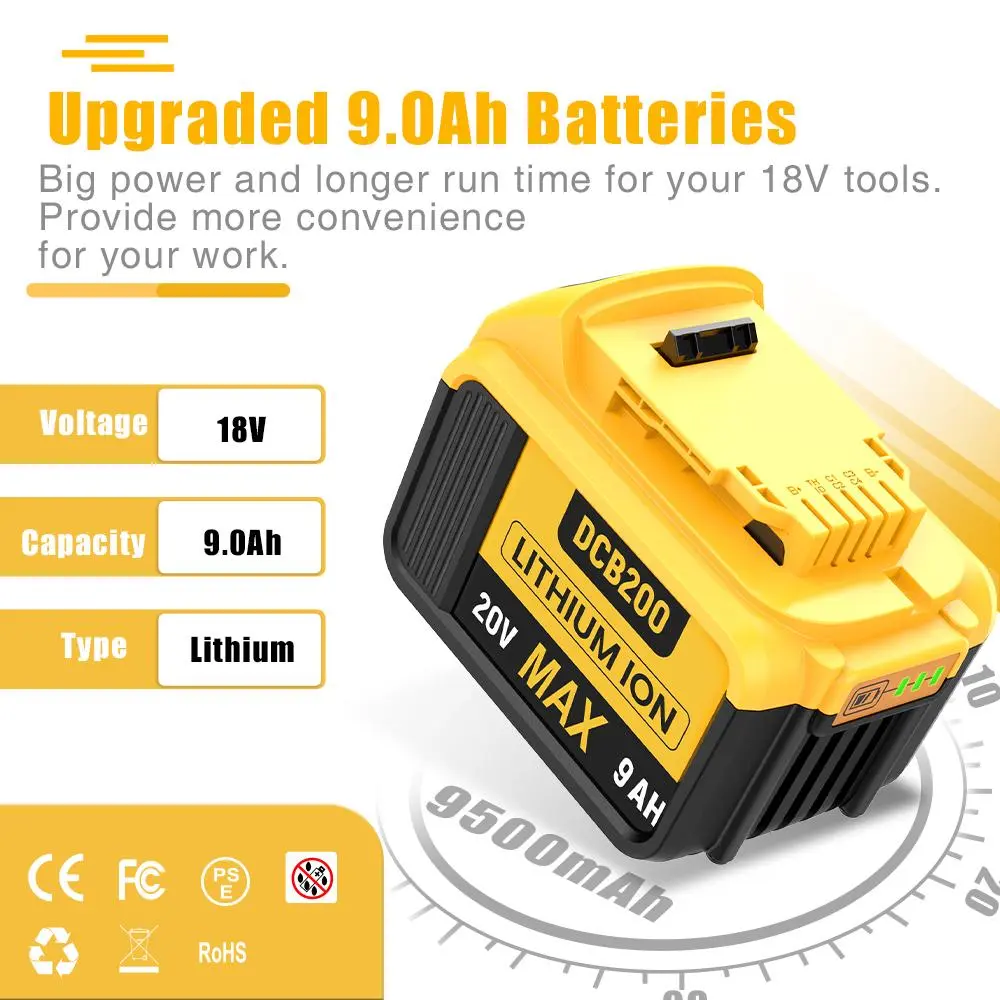 ·Battery Details: Brand New | Battery Type: Li-ion | Voltage: 20 Volt | Capacity: 9000mAh | Replacement for Dewalt 20V Battery.