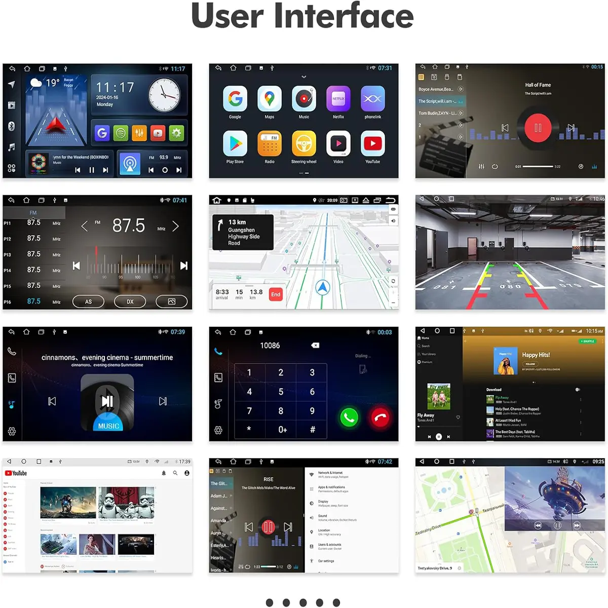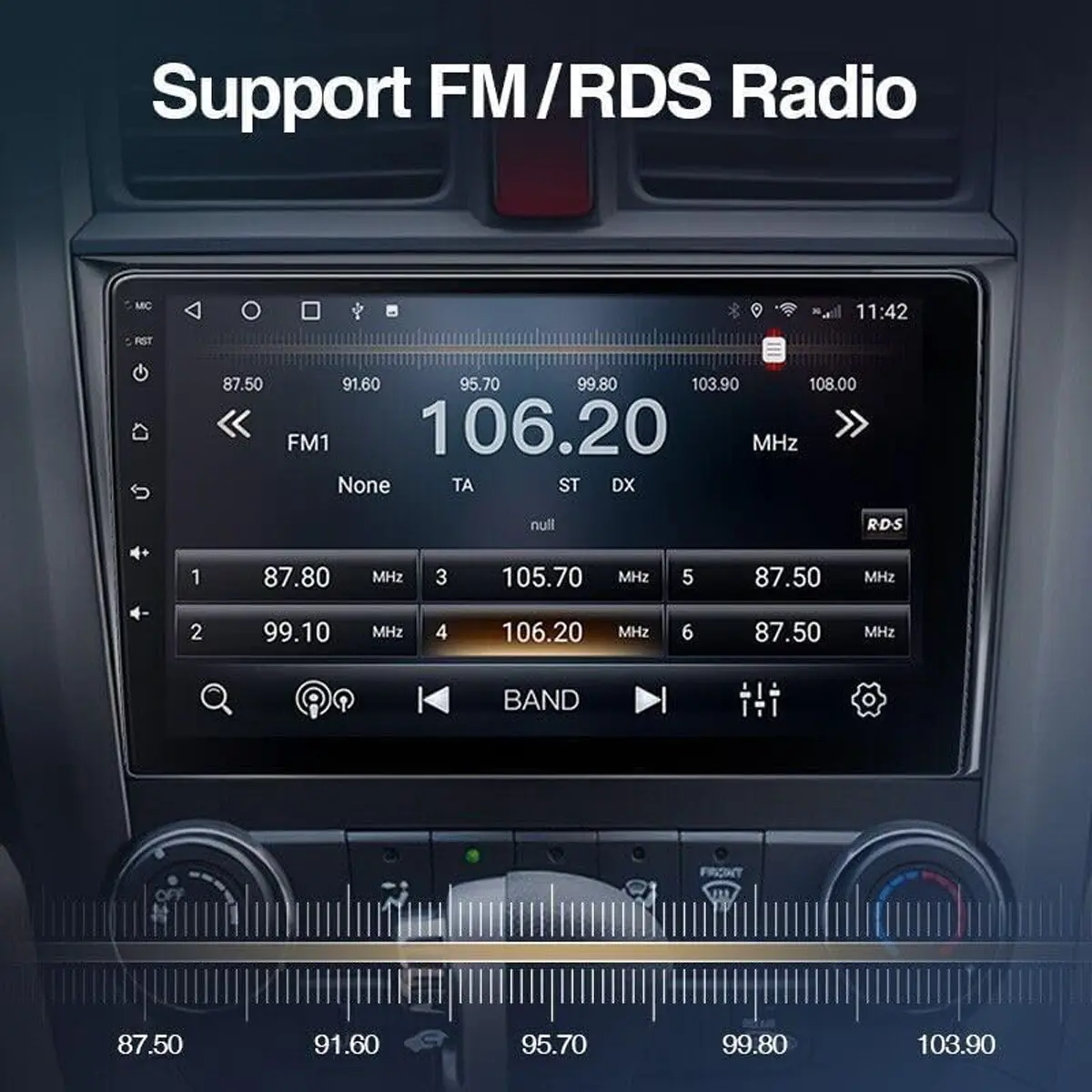 FM radio with 18 preset stations. Supports 87.5–108 MHz. You can also transmit phone music to the car via FM.