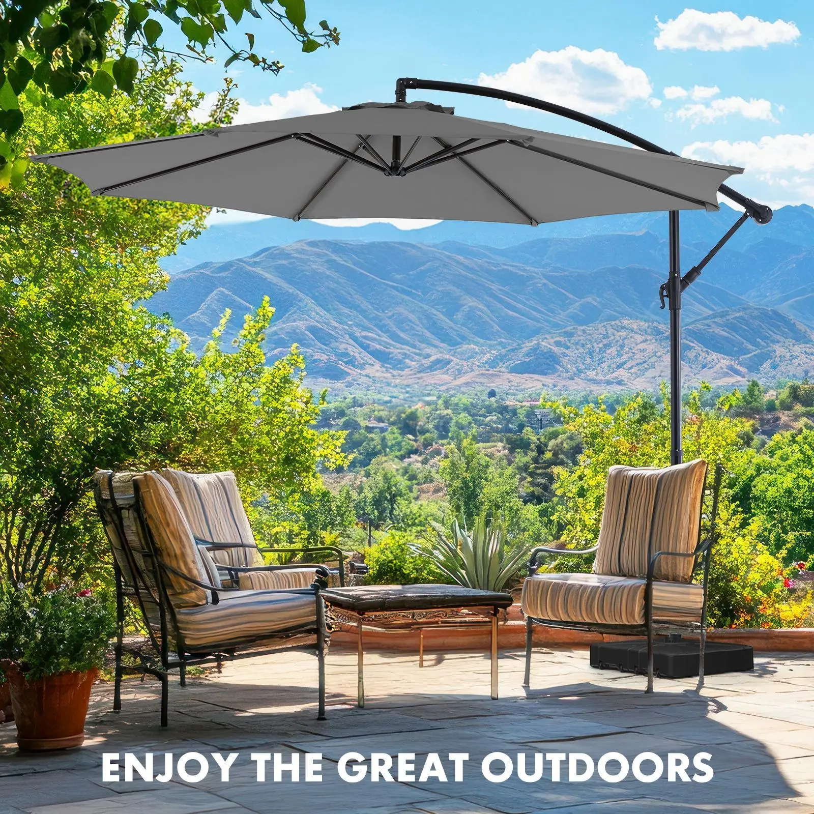 ·Premium Canopy Material: Made with high- quality polyester fabric, the cantilever umbrella provides UPF50+sun protection and resists fading over time. Please store the offset umbrella indoors during extreme weather conditions for longevity.