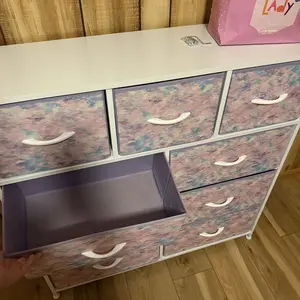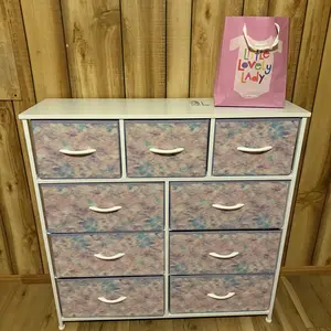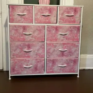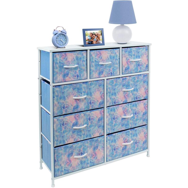 Update your child’s room with our 9-Drawer Dresser. This colorful chest features a tabletop surface and pull-out drawers to tuck away household clutter. Place all of your child’s folded t-shirts, jeans, and pajamas, or extra blankets and toys within the spacious fabric drawers.