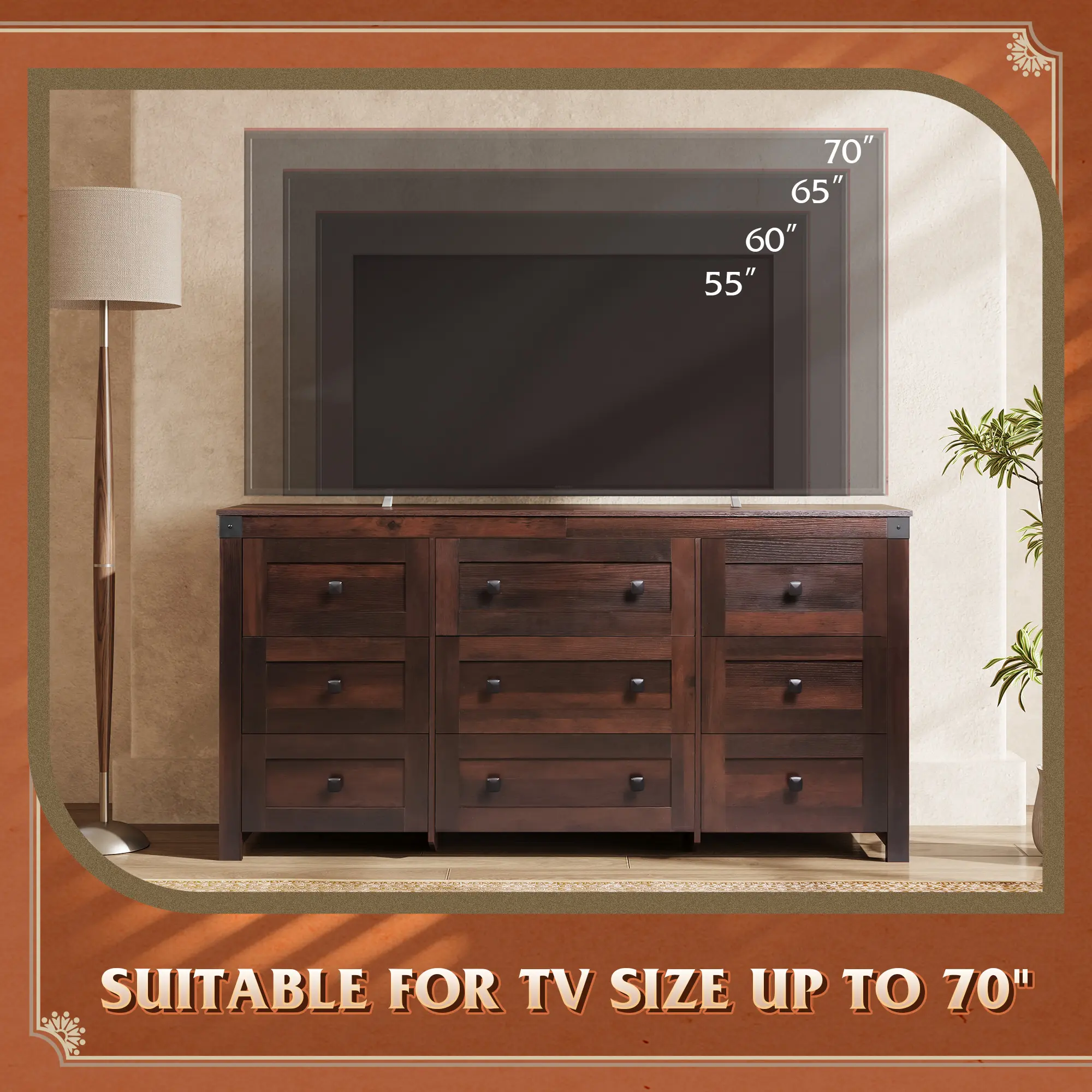 ·SPACIOUS STORAGE SPACE: 15.67"D x 62.20"W x 31.50"H. This chest of drawers comes with six 13.31-inch depth, 14.8-inch width drawers, three 13.31-inch depth, 21.37-inch width drawers, providing as much storage space as possible for different items, effectively keeping your room neat and organized. The wood top is perfect for placing a TV up to 70" TV and frequently used items.