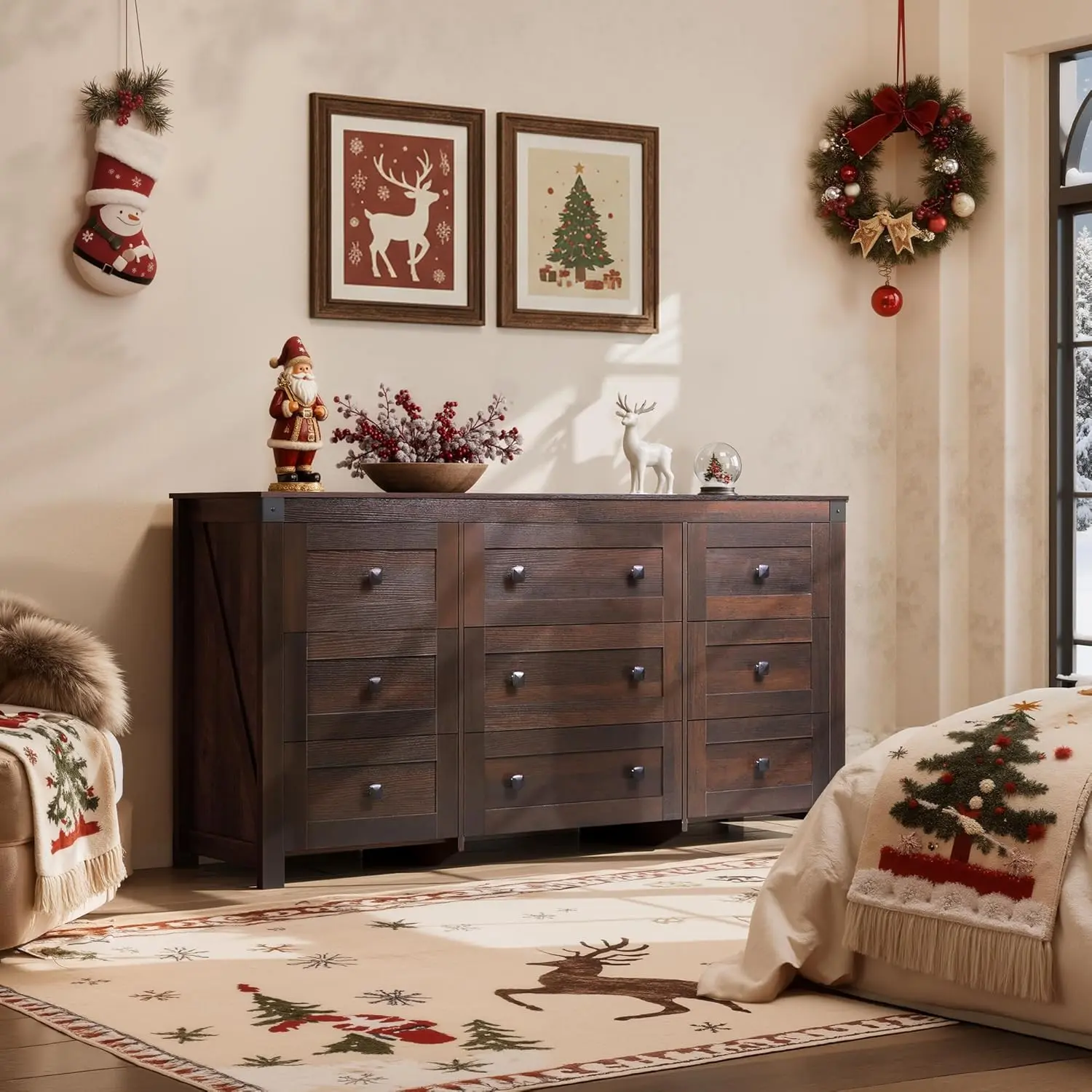 ·FARMHOUSE 9 DRAWERS DRESSER: This wooden dresser farmhouse look is heightened by the rustic color finish coupled with the side barn sign and the dark square handle adds a rustic charm. It can be used for bedroom clothing organizer, entryway table, decorative storage for living room.