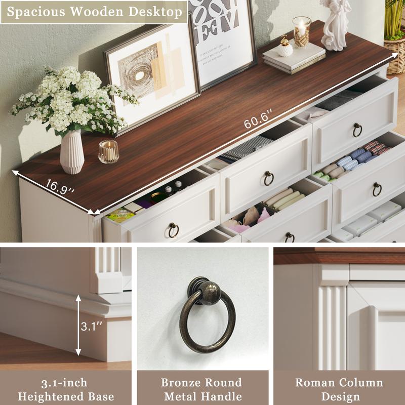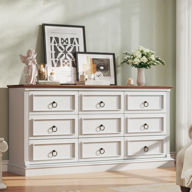 ·Elegant Farmhouse 9-Drawer Dresser: This 9-drawer dresser seamlessly blends rustic farmhouse charm with timeless Roman column details. Featuring a walnut-finished top, antique bronze circular metal handles, and a crisp white finish with an elegant embossed texture, it complements modern, rustic, and mid-century interiors, adding warmth and sophistication to any room.