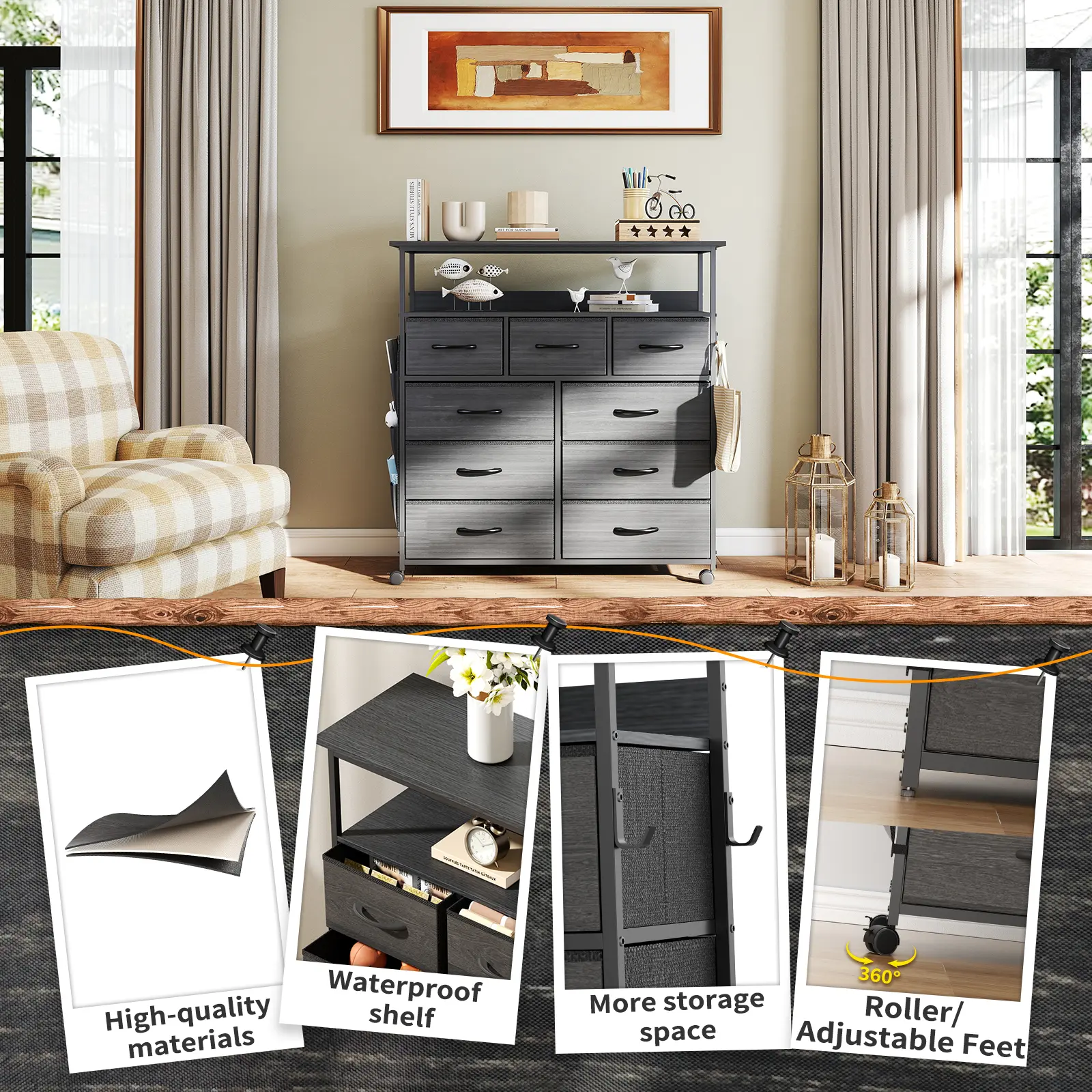 ·【Large Capacity, More Organized】With 9 spacious drawers and double top shelves, this fabric dresser offers rich functionality in a compact space, perfect for storing clothes, toys or daily necessities while keeping the space visually tidy.