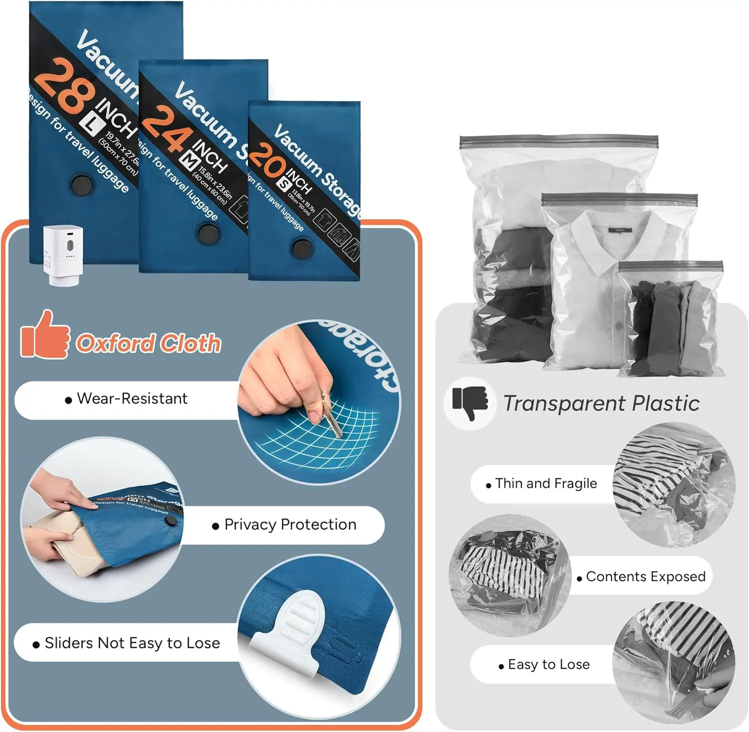 ·L: 50 x 70 cm (fits 28-inch suitcase, perfect for bedding and thick clothes)