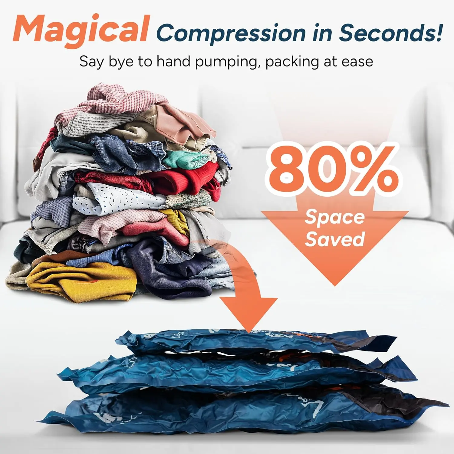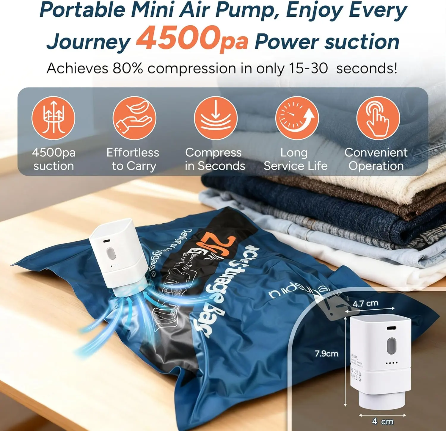 ·【Powerful 4500Pa Cordless Pump 】 Features a robust -4500Pa suction power that compresses a bag in just 10-15 seconds. The built-in high-capacity battery provides unparalleled freedom, allowing you to vacuum an impressive 90+ bags on a single charge—ideal for long business trips and large-scale home organization.