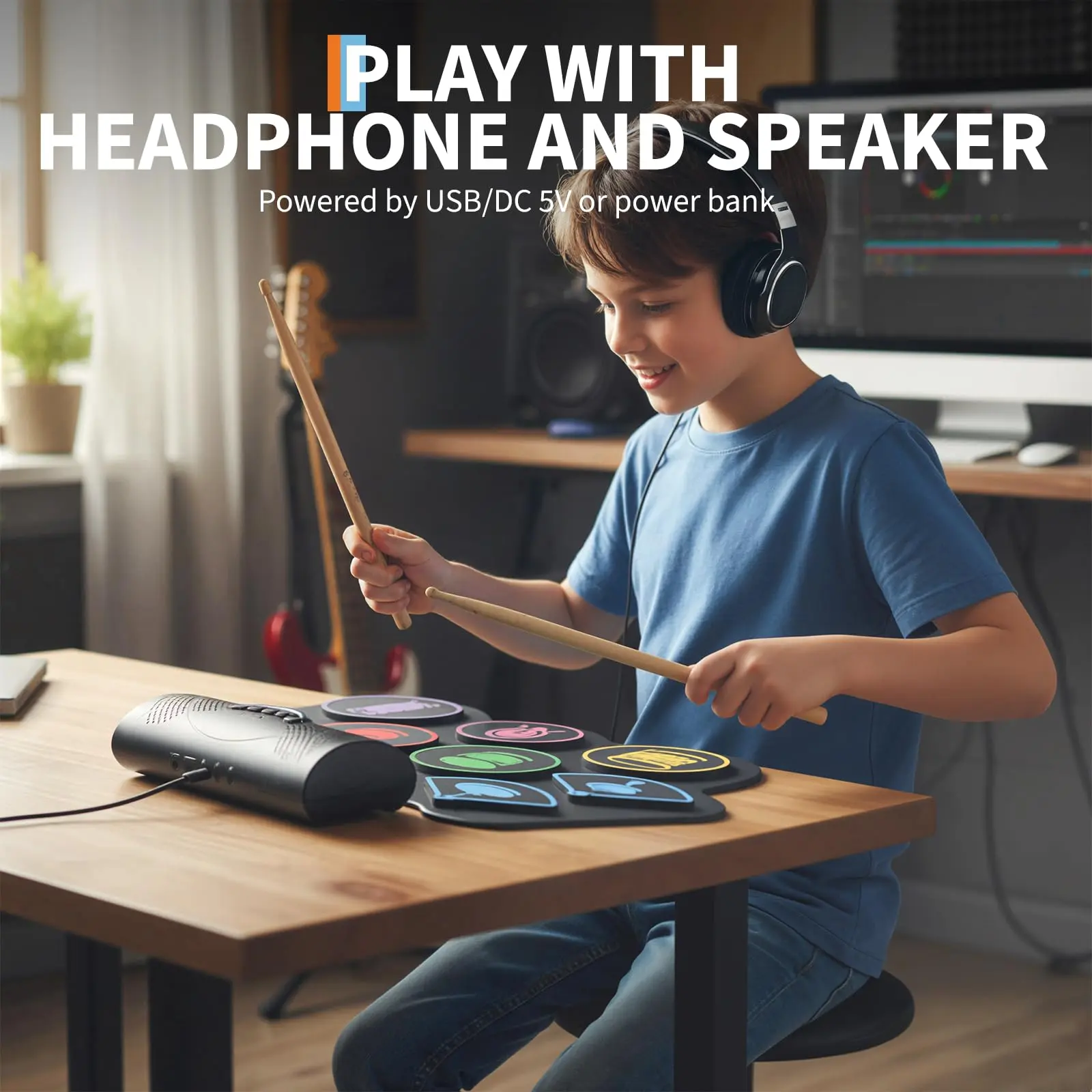 🥁Rechargeable, Long-Lasting Battery: Built-in battery provides up to 10 hours of drumming per charge. Conveniently powered by USB, DC 5V, or power bank, this drum pad set keeps the music going at home or on the move
