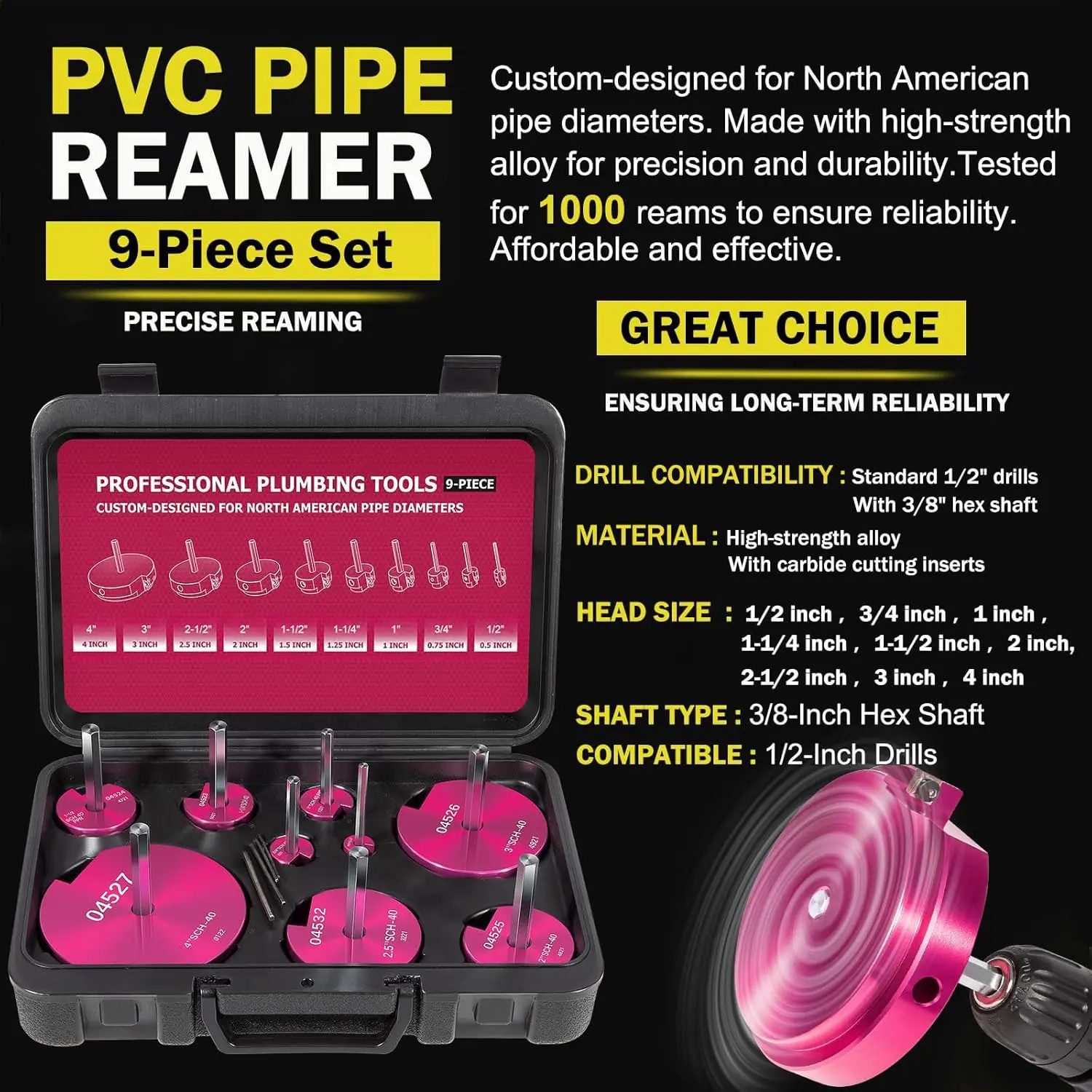 Comprehensive 9- Set Design:This PVC pipe reamer kit comes with 9 different reamer sizes, including 1/2", 3/4", 1", 1-1/4", 1-1/2", 2", 2-1/2", 3", and 4". The kit is ideal for a wide range of plumbing tasks, from small repairs to larger installations, providing versatility for professionals and DIYers alike. Whether you are working on pipes for residential or commercial projects, this set offers everything you need.