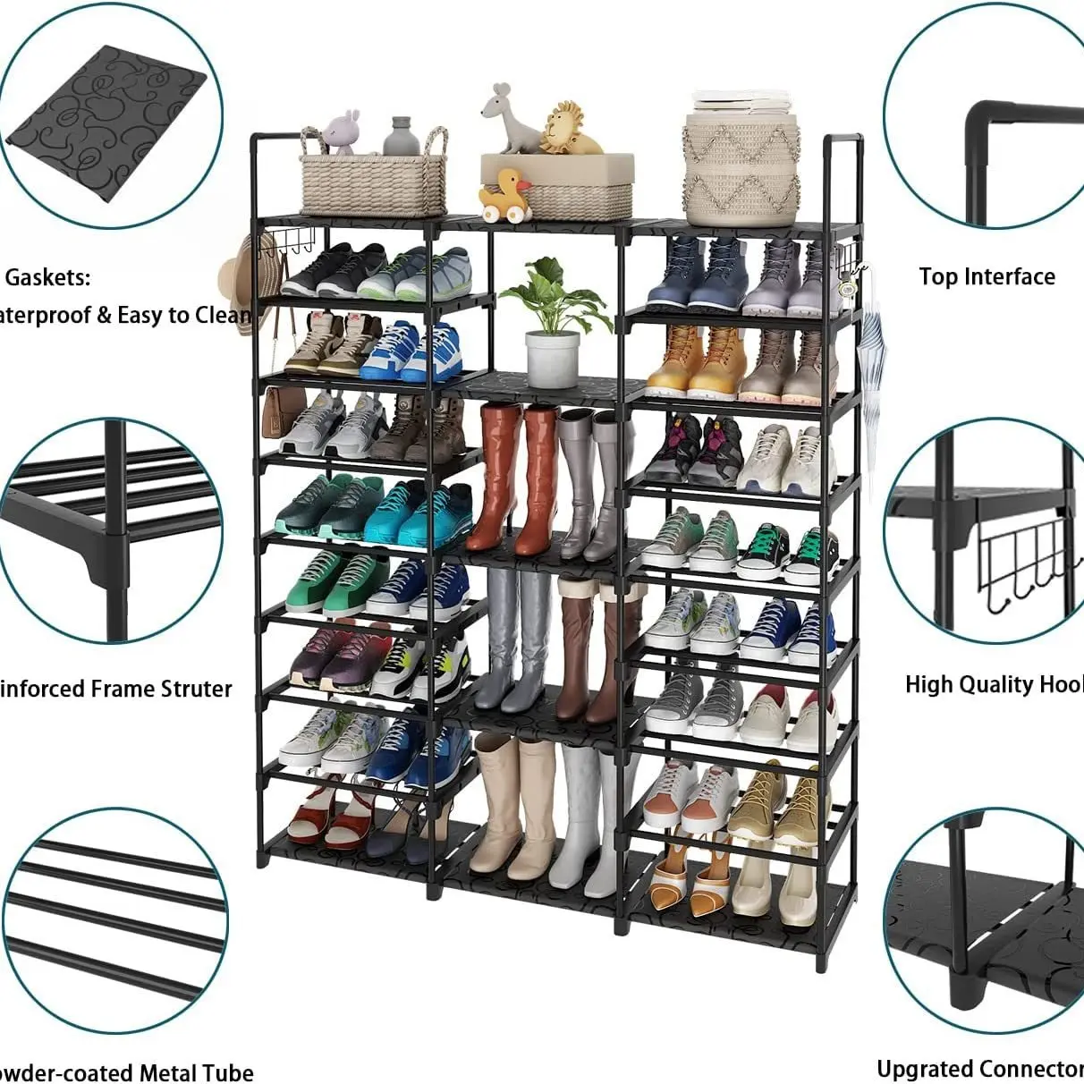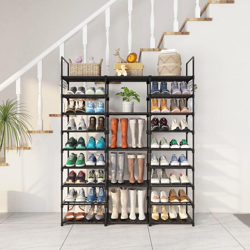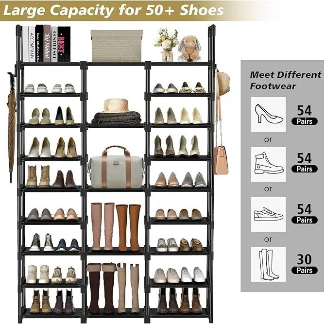 ·Designed with 9 tiers and matched with waterproof PP boards, the shoe rack can hold up to 50-55 pairs of shoes and boots of all sizes, perfect for large families and shoe enthusiasts.
