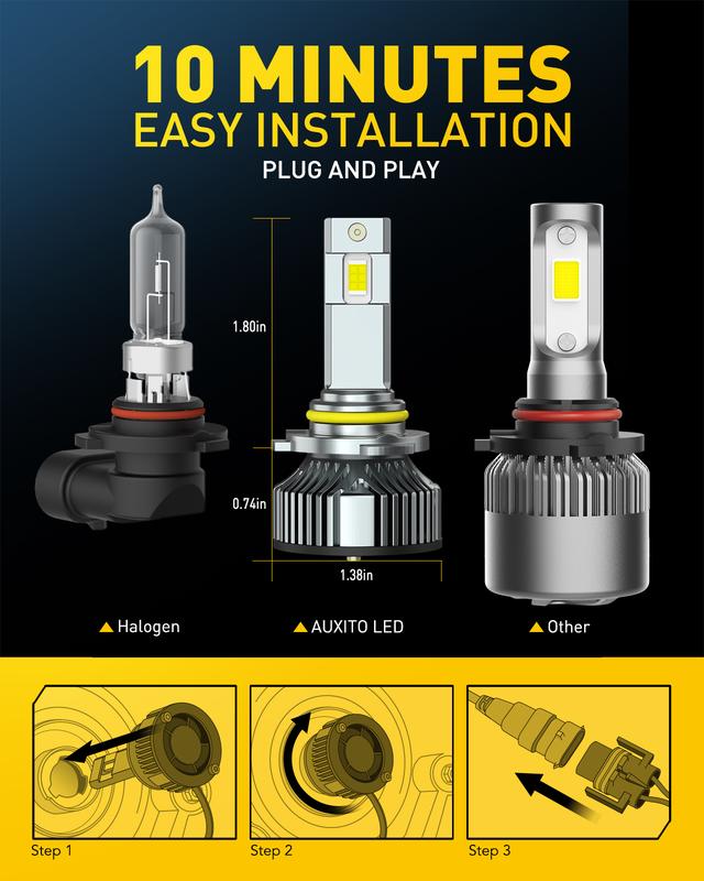 ·[Easy Installation]: AUXITO 9005 bulbs are designed with a mini-size nearly identical to halogen bulbs, ensuring a perfect fit without modifications. The non-polarity socket and interference-free design allow seamless integration into the headlight housing. Enjoy plug-and-play convenience—installation takes under 10 minutes for a hassle-free upgrade.