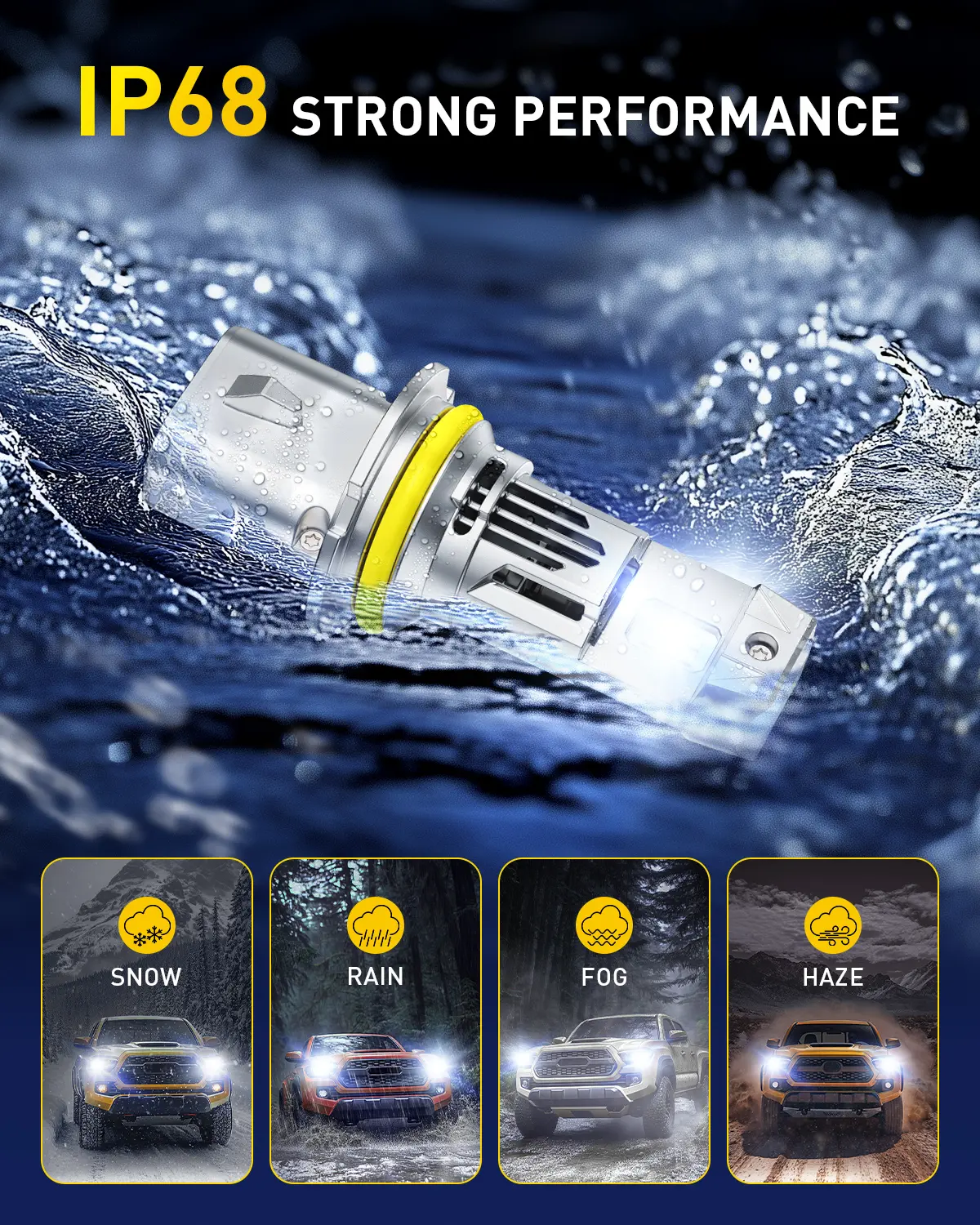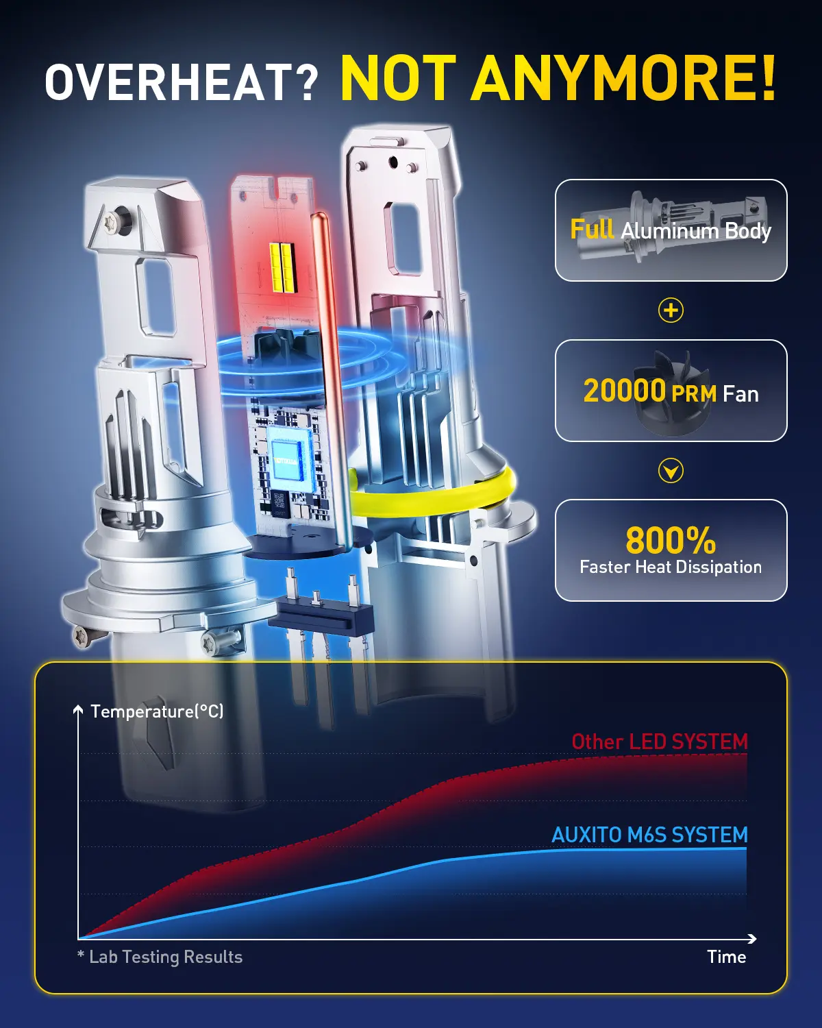 ·9007 bulbs with an aluminum body and 16,000 RPM super-speed cooling fan. Their lifespan extends up to 60,000 hours, sparing you from frequent replacements
