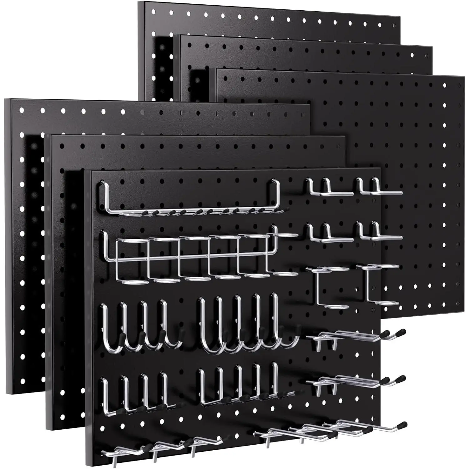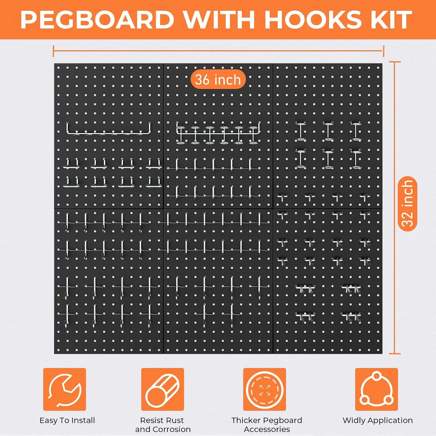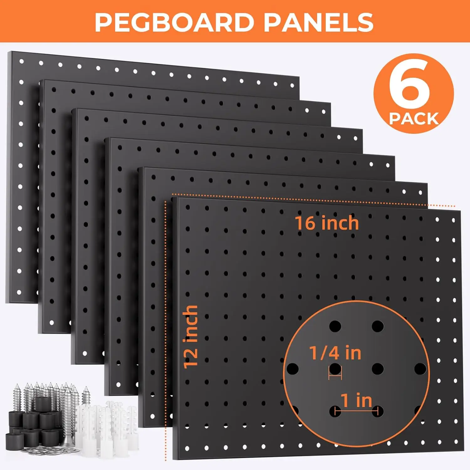 PEGBOARD WITH HOOKS KIT: The pegboard wall organizer comes with 6pcs metal pegboard panels and 84pcs 1/4 Inch pegboard hooks in 12 different types, curved hooks, angled hooks, straight hooks, ring tool holder and multi tool rack.Also 60pcs steel peg lock to double fit the hooksTHICKER METAL PEGBOARD PANELS: With size 12"x16", the 6pcs black pegboard are made of high quality metal material, also the all metal construction and black galvanized finish provides maximum strength, resist rust and corrosion.Freely form 96" x 12" or 48" x 24" pegboard wall by your needs on solid wall, such as wood, brick, conceret wall, Not drywall1/4 INCH PEGBOARD HOOKS: The peg board hooks are made of hardened steel construction to provide maximum strength, more durable and corrosion-resistant.Each hook has double stabilizing peg to prevent shaking and falling out, ensures long lasting durabilityEASY TO INSTALL: There are mounting hardware and installation guide included in package to have a clear understanding of our garage pegboard organization, all you need is an electric drill and a level to make sure they are lined up for mounting on into the wallWIDE APPLICATION: This peg board organizer is ideal for storage solutions on a wide range of garage, workbench, workshop, kitchen, shop, school, tool sheds, factory, or warehouse. And the pegboard tool holders could be arranged in a compact style, save more space and get effortless accessible for a variety of small hardware or tool