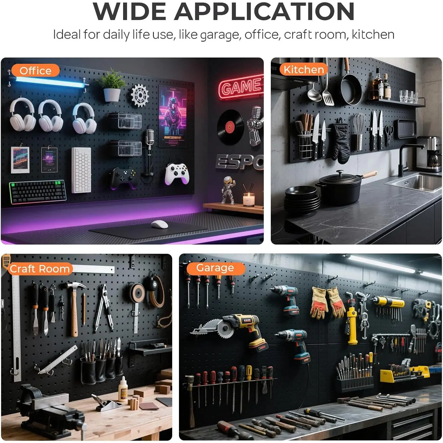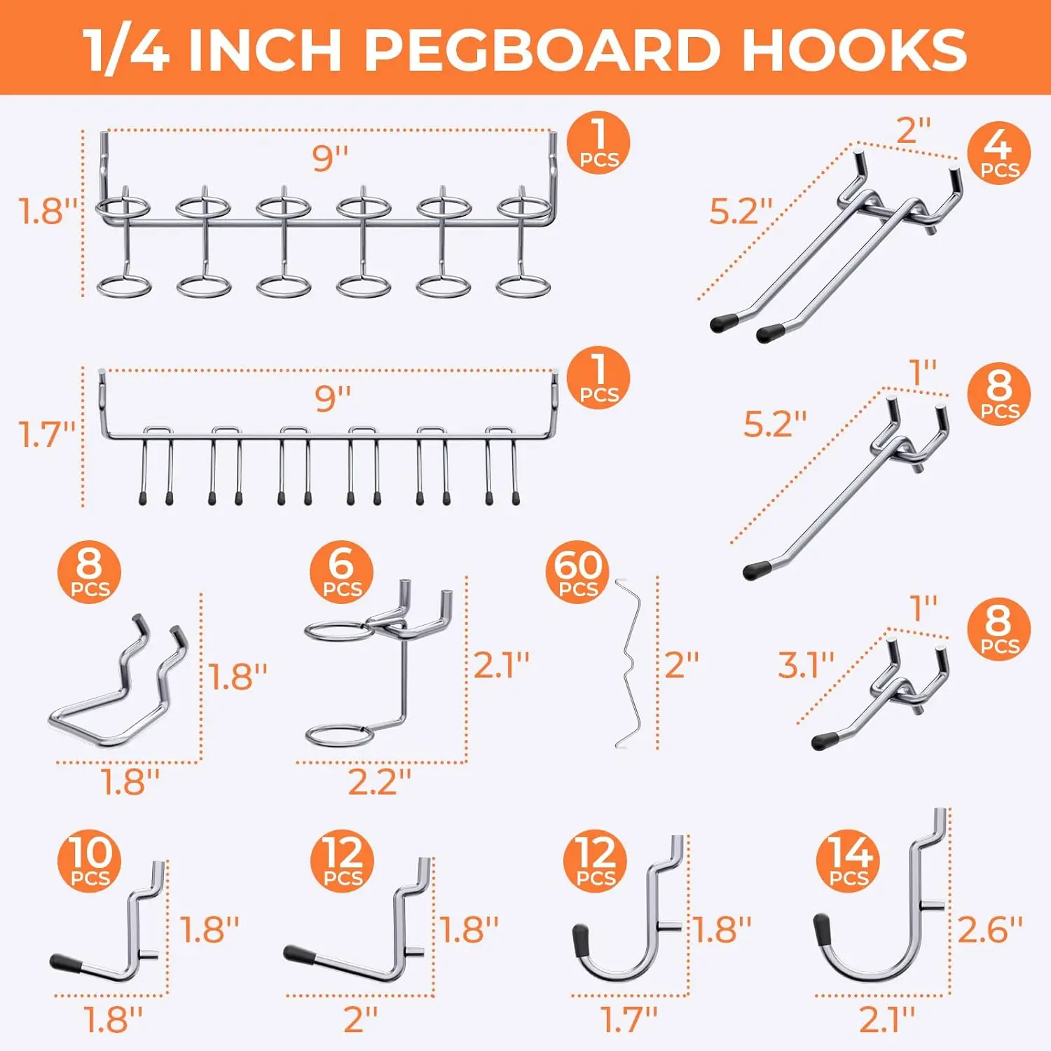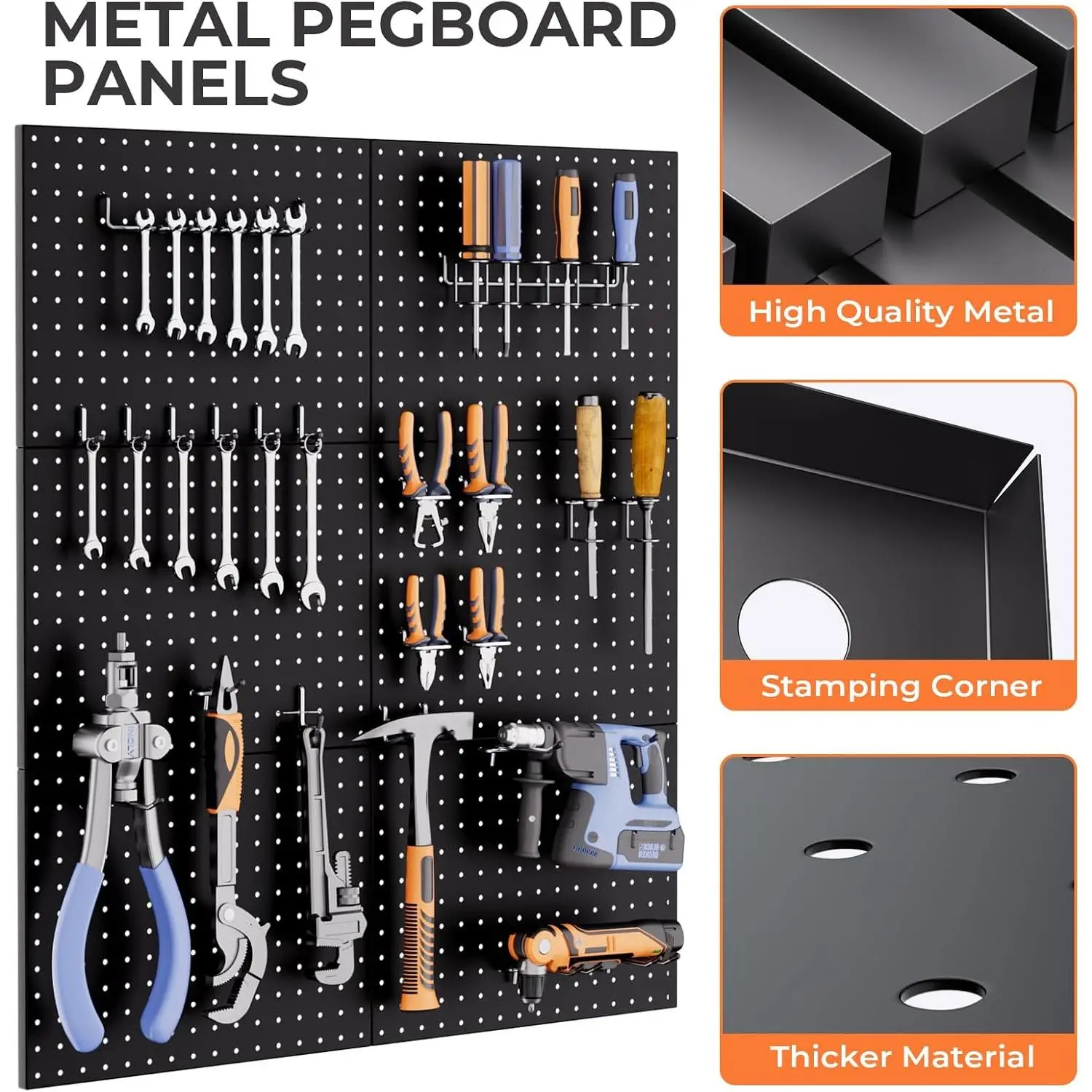 PEGBOARD WITH HOOKS KIT: The pegboard wall organizer comes with 6pcs metal pegboard panels and 84pcs 1/4 Inch pegboard hooks in 12 different types, curved hooks, angled hooks, straight hooks, ring tool holder and multi tool rack.Also 60pcs steel peg lock to double fit the hooksTHICKER METAL PEGBOARD PANELS: With size 12"x16", the 6pcs black pegboard are made of high quality metal material, also the all metal construction and black galvanized finish provides maximum strength, resist rust and corrosion.Freely form 96" x 12" or 48" x 24" pegboard wall by your needs on solid wall, such as wood, brick, conceret wall, Not drywall1/4 INCH PEGBOARD HOOKS: The peg board hooks are made of hardened steel construction to provide maximum strength, more durable and corrosion-resistant.Each hook has double stabilizing peg to prevent shaking and falling out, ensures long lasting durabilityEASY TO INSTALL: There are mounting hardware and installation guide included in package to have a clear understanding of our garage pegboard organization, all you need is an electric drill and a level to make sure they are lined up for mounting on into the wallWIDE APPLICATION: This peg board organizer is ideal for storage solutions on a wide range of garage, workbench, workshop, kitchen, shop, school, tool sheds, factory, or warehouse. And the pegboard tool holders could be arranged in a compact style, save more space and get effortless accessible for a variety of small hardware or tool