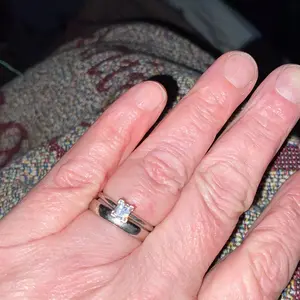 I’ve had this on since it arrived looks so cute with my engagement ring! I put my wedding band on my right hand with my first engagement ring!! Love the thickness of it! Exacy the look I wa going for!!