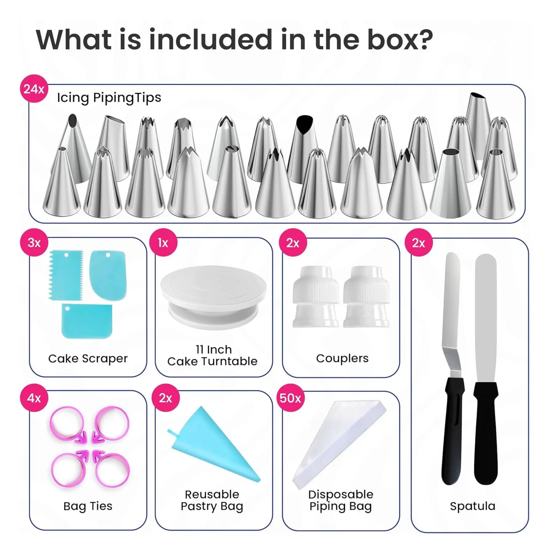 This all-in-one baking kit includes a rotating cake stand, 24 icing piping tips, 2 cake spatulas, 3 cake scrapers, 50 16 Inch disposable piping bags, 6 Cupcake Liners, 2 reusable pastry bags, 4 bag ties, and 2 couplers.for all your cake decorations.