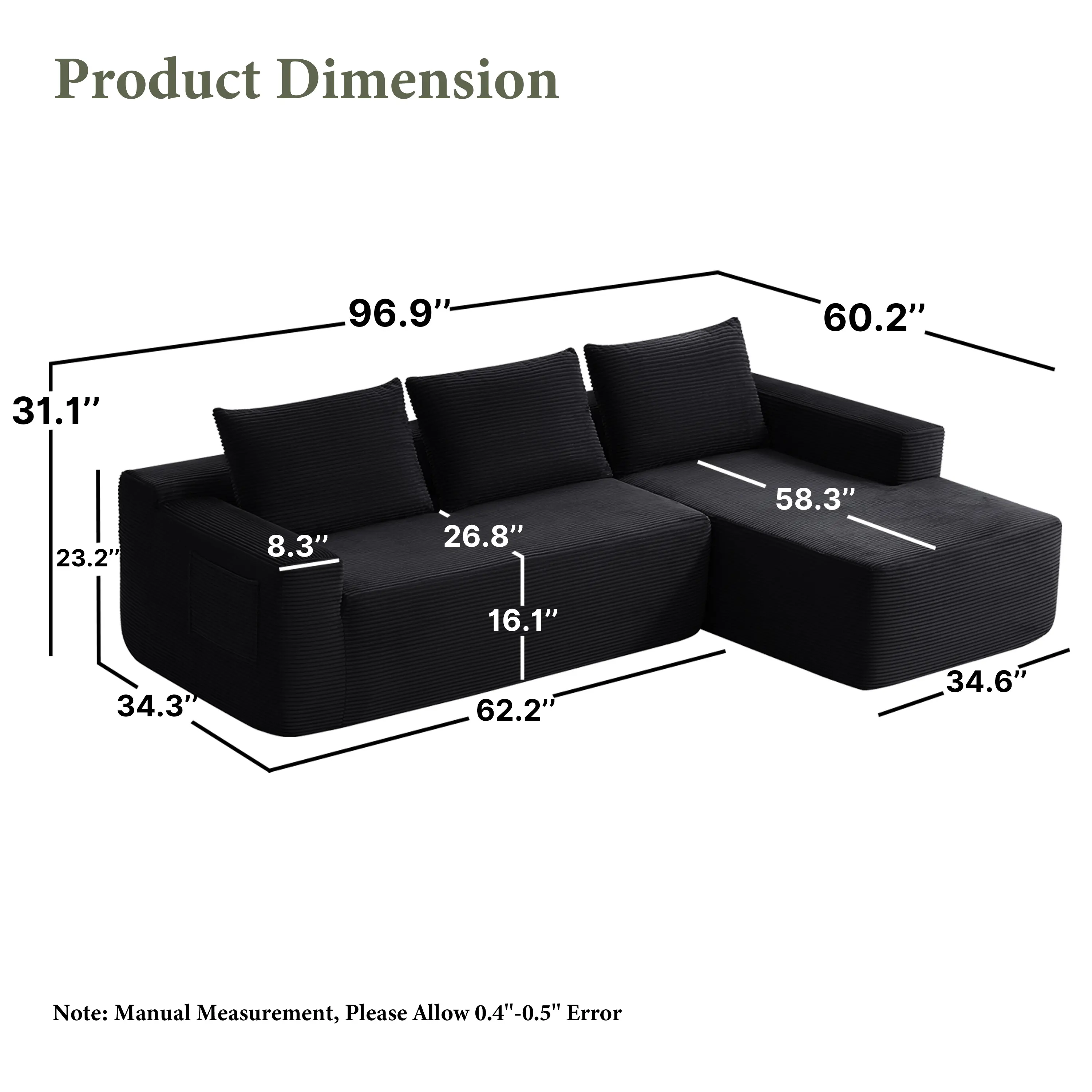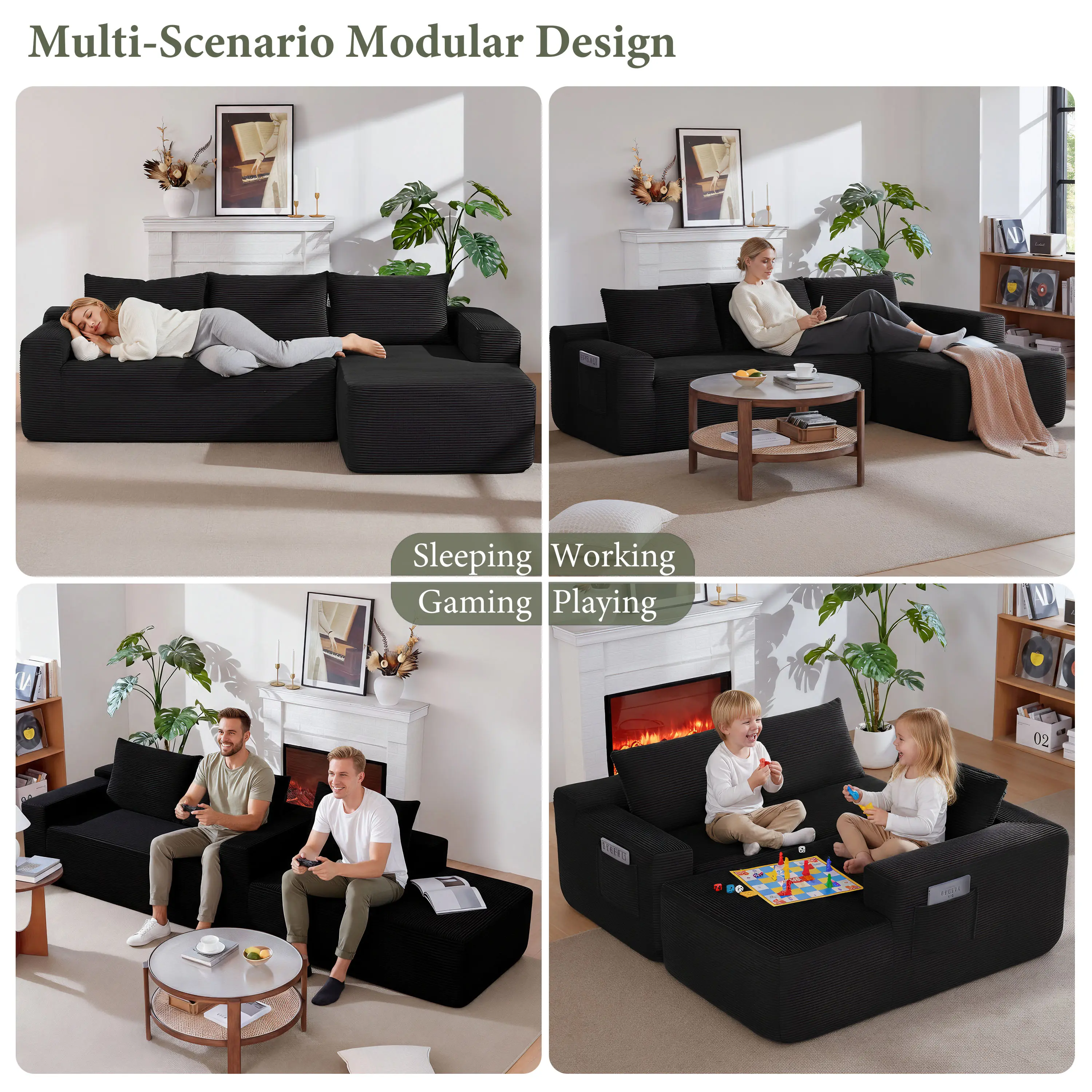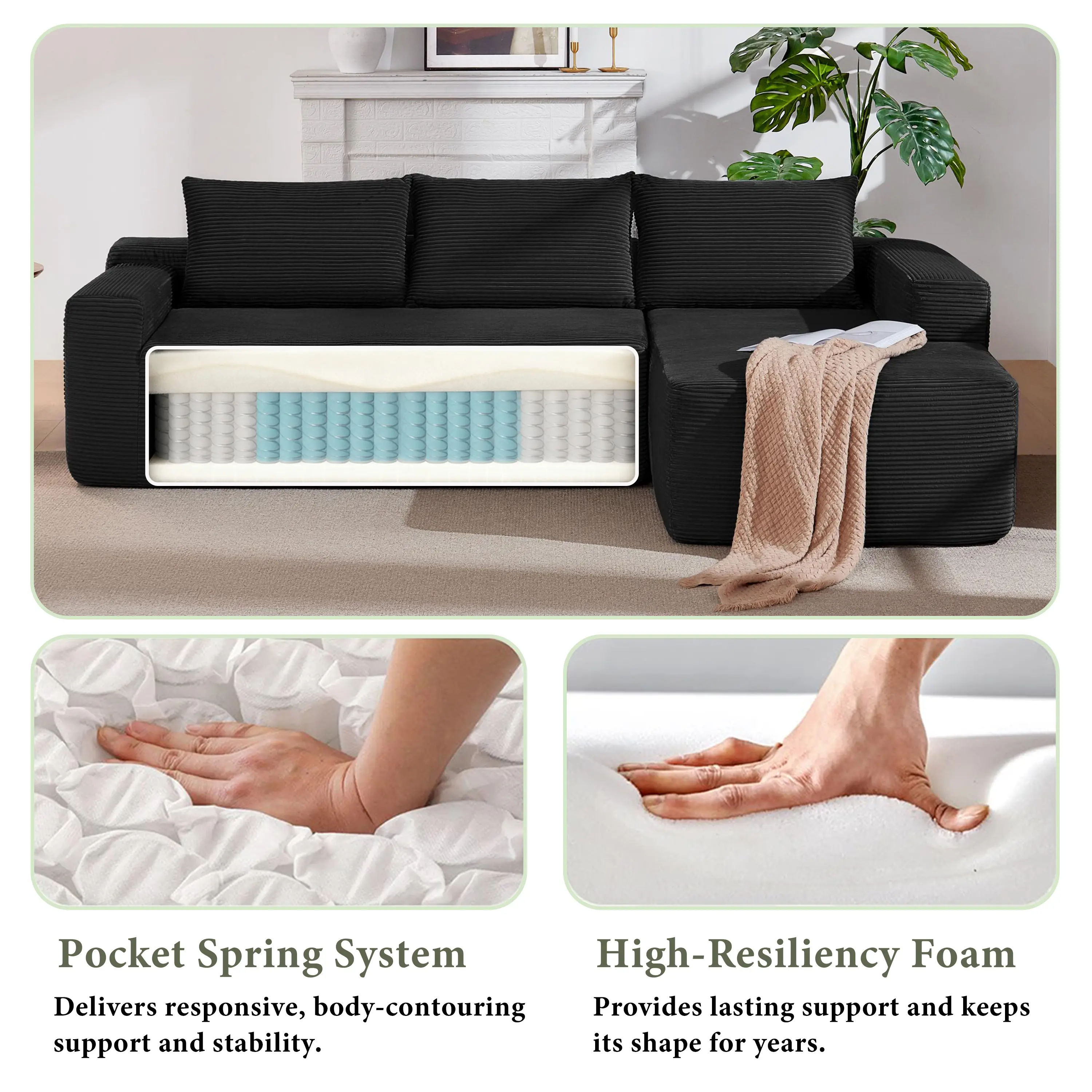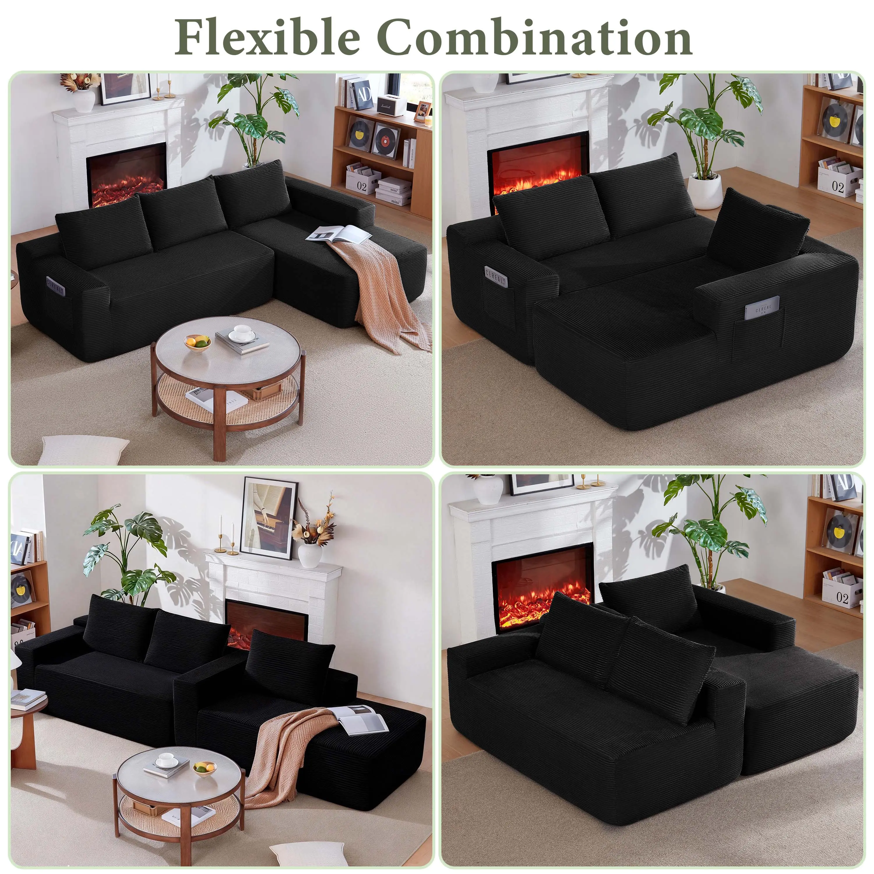 ·Modular Sectional Sofa:This sectional sofa featuring a sleek design, clean lines, and high-quality plush corduroy Fabric,This sectional set maximizes space when placed against a wall,this corner sofa effortlessly adds a timeless and sophisticated touch to your home. Designed to be the focal point of attention, it's an ideal choice for elevating the ambiance of living rooms, apartments, and bedrooms.