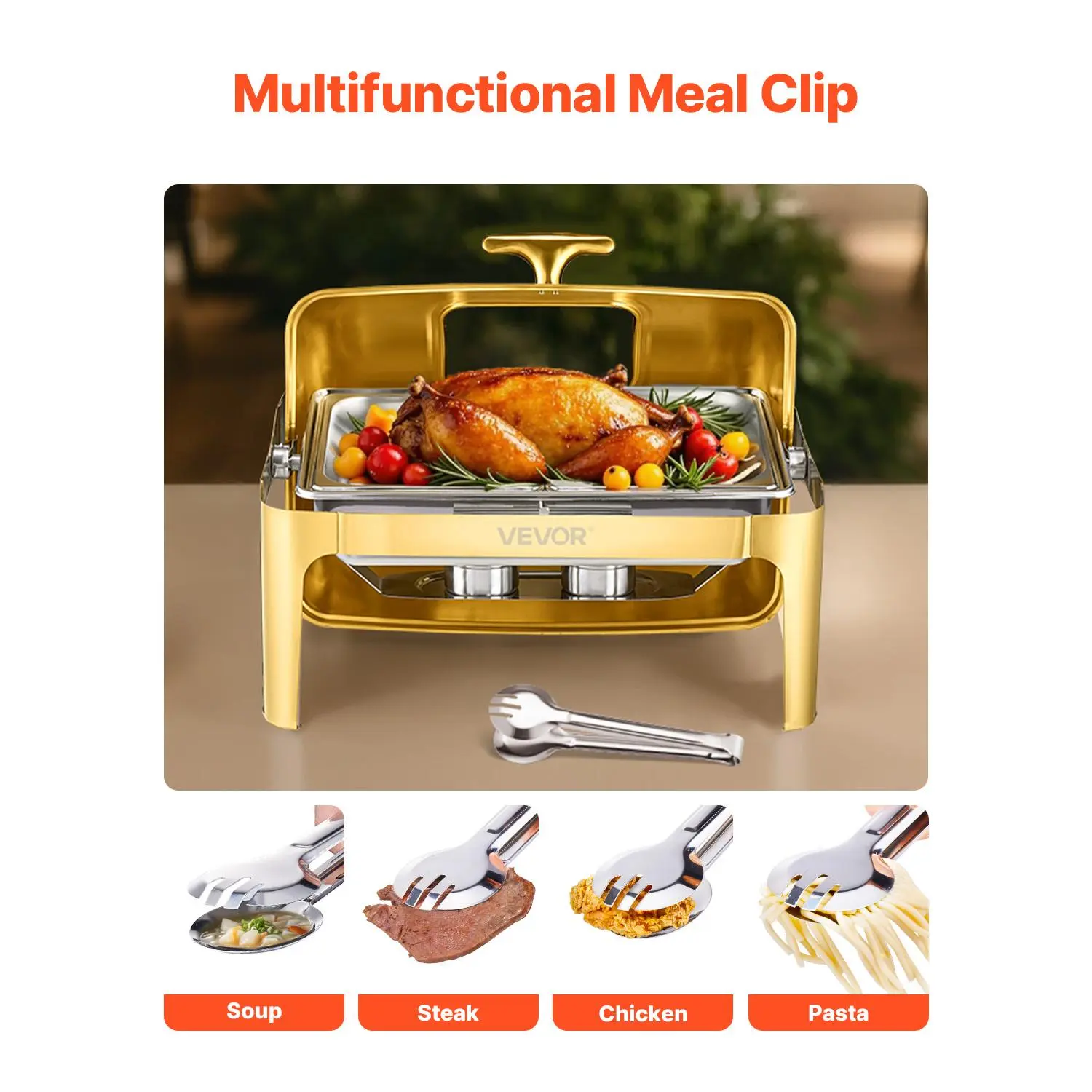 ·Ample 9QT Capacity: With a large capacity, this buffet chafer can hold multiple servings of your favorite dishes. The included multifunctional meal clip makes it easy to serve pasta, steak, soup, chicken, and more