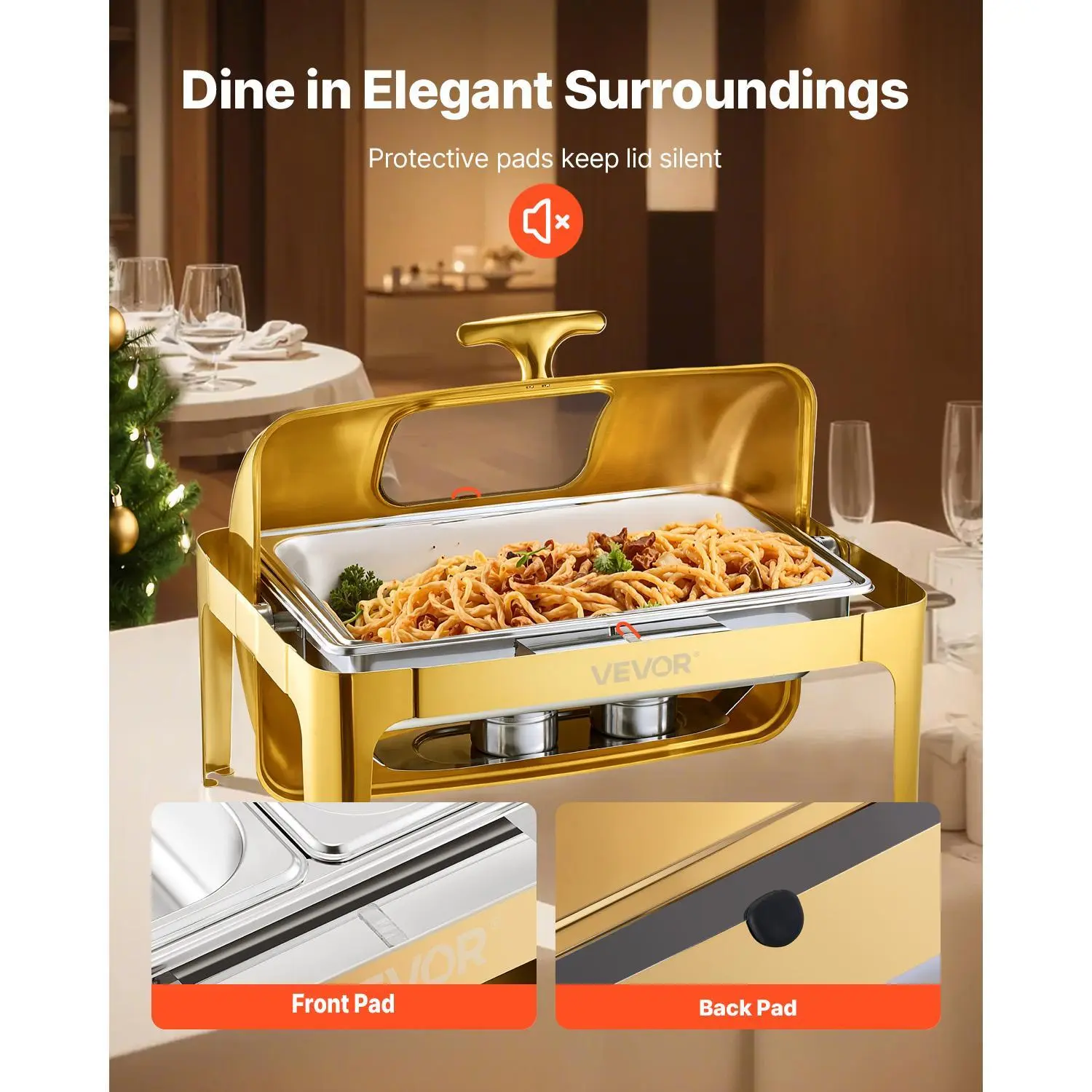 ·90/180° Roll Top: The dome cover of this chafing dish buffet locks at 90 degrees or rolls over to 180 degrees, offering easy access from all sides. It helps dishes in it stay warm and retain their humidity