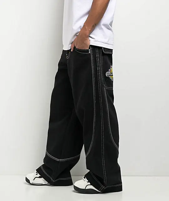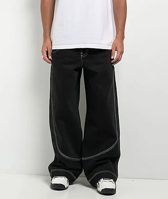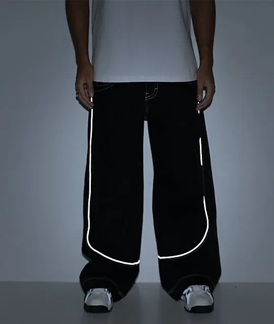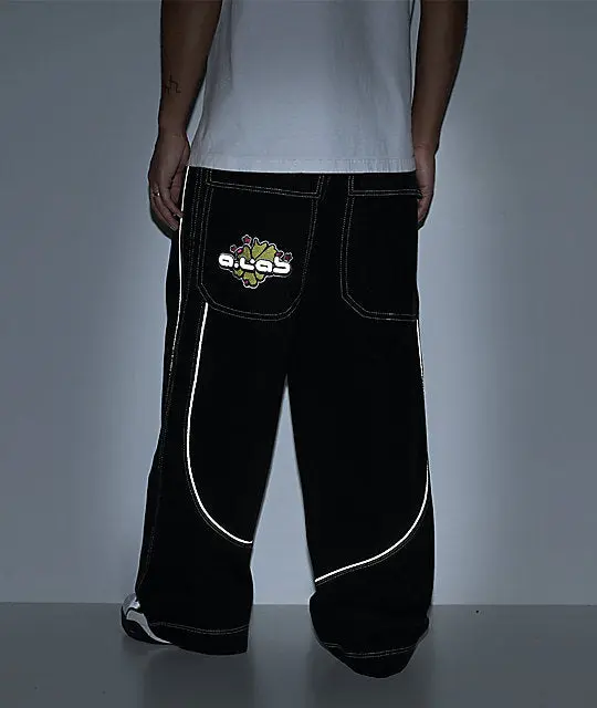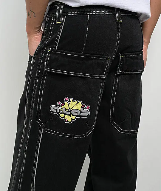 Be prepared to make a statement with the Mega Piped jeans from A.LAB, landing in a solid black cotton construction with white contrast stitching throughout and illuminating, reflective Pipe accents on the front and back. Designed with exaggerated depths in the five-pocket layout for ample storage, the oversized bottoms showcase Y2K-style branding on the left seat pocket as a nostalgic touch. The baggy denim pants are finished by embossed hardware on the standard button fly with zip closure.