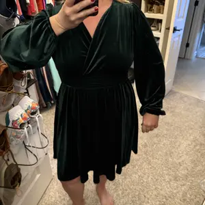 Dark hunter green color, stretchy soft velvet material, beautifully designed v neck criss cross makes it adjustable for bust size makes this dress an instant favorite. True to size X-Large and hits right at knees to be classy and classic for your winter wardrobe dress needs