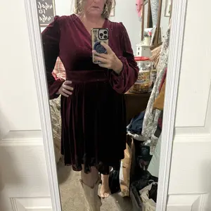 Purchased this dress and worn on Christmas. A great purchase. Dress is a beautiful, rich wind color and the fabric is a soft velveteen. I’m 5’4” 160 lbs and the XL was a good fit. Loved that the v-neck was not too deep as I do not like to show cleavage. Great purchase would recommend.