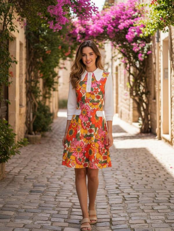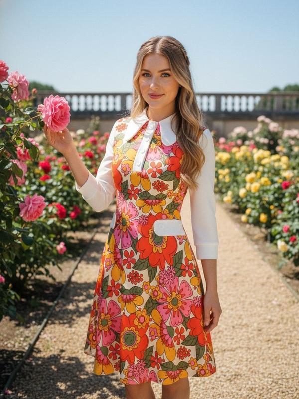 5. Orange 1960s Lapel Flowers Patchwork Dress Casual Boho Style Spring Holiday Floral Womenswear Holiday