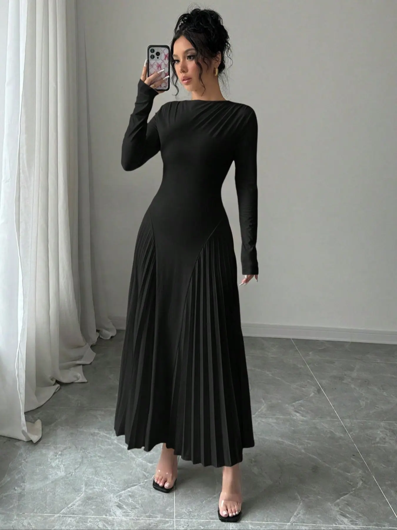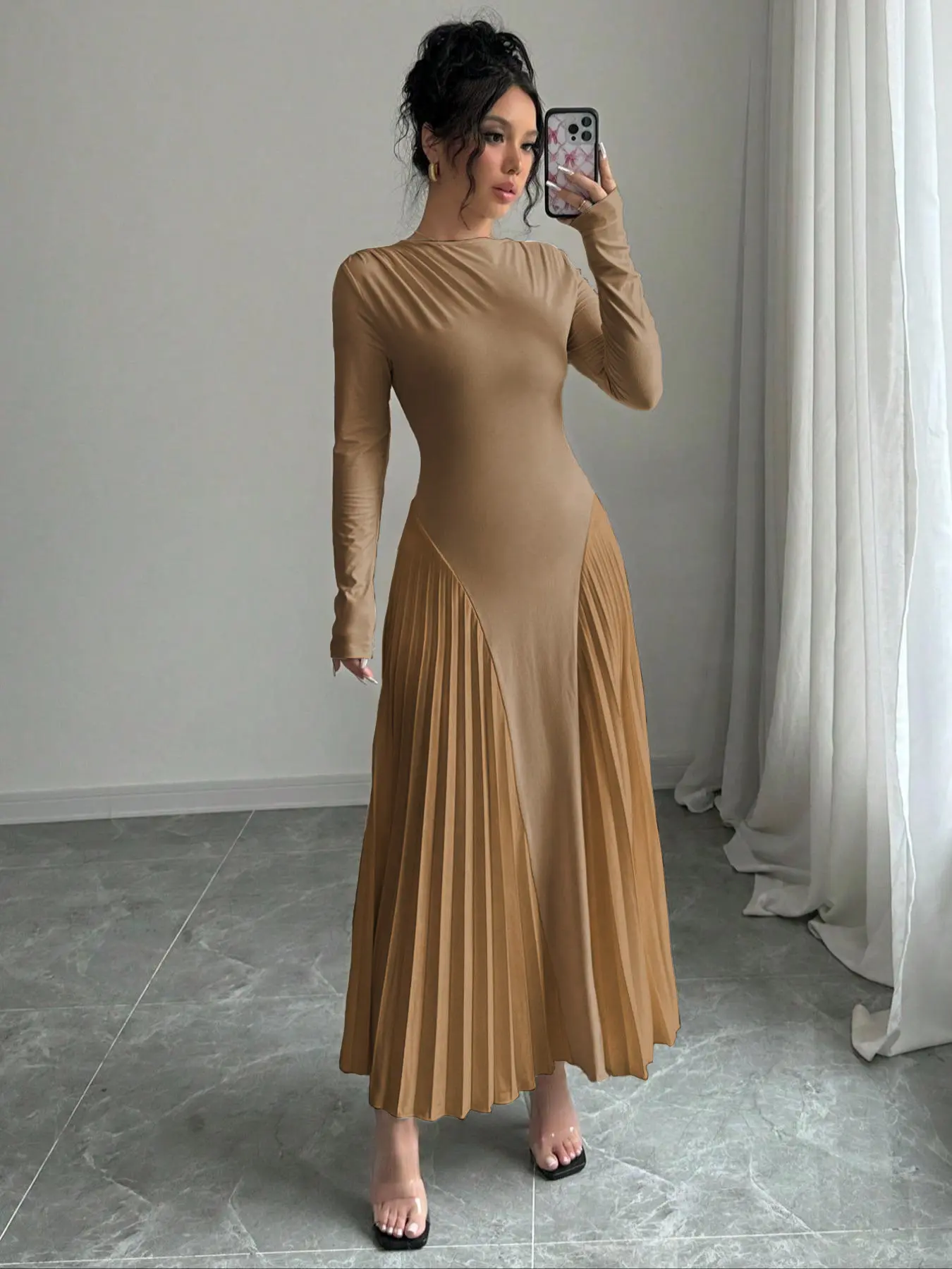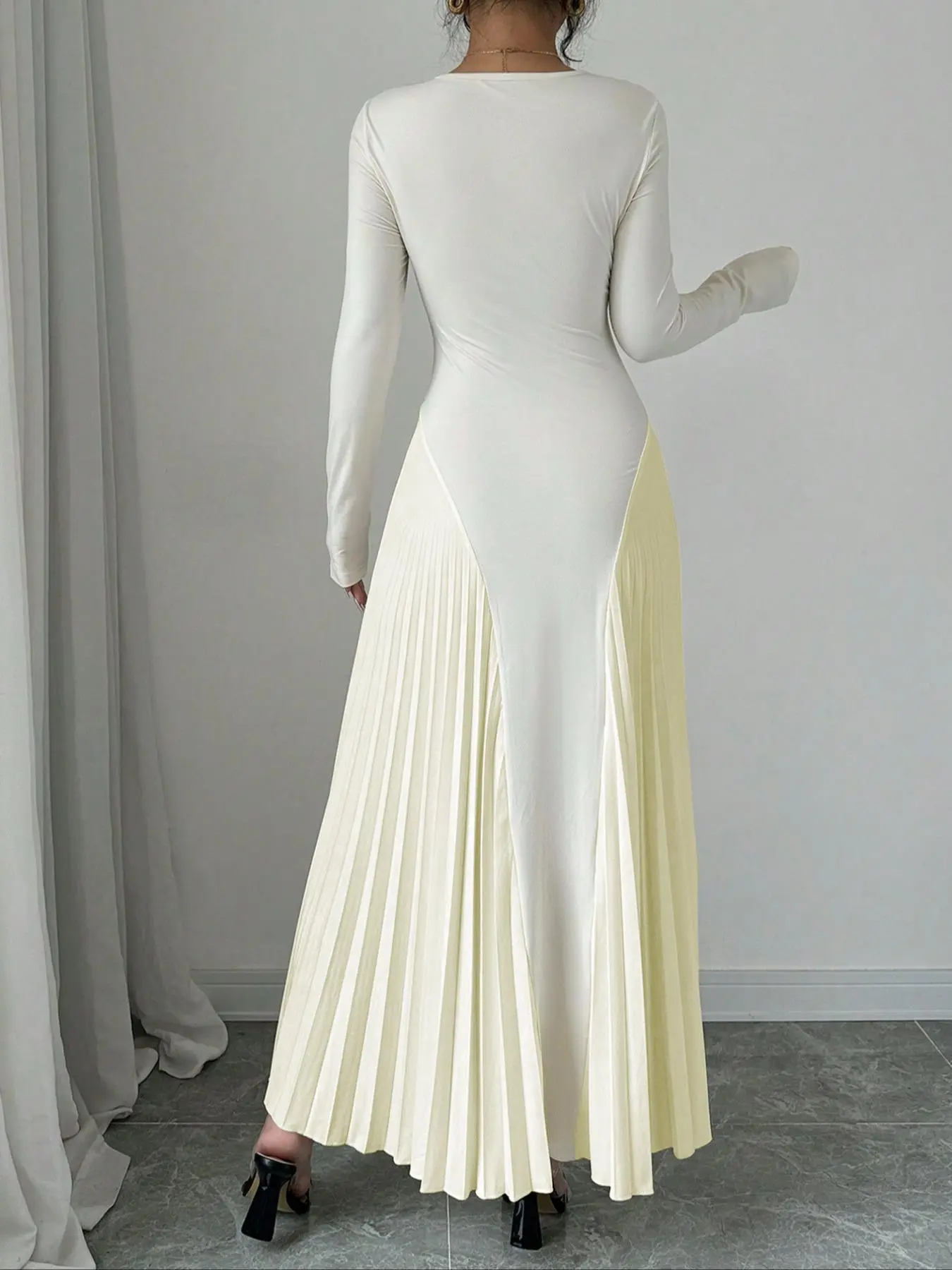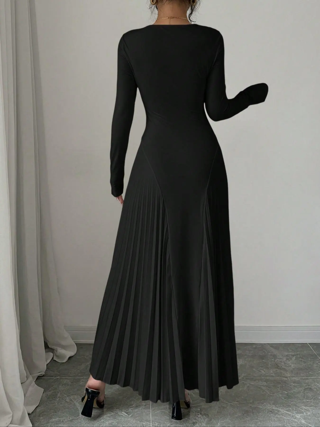 The style, fit, size, and color of this dress was perfect. I love the design of the dress and how the pleats on the side of the hips adds elegance. The material is very soft and flows beautifully.