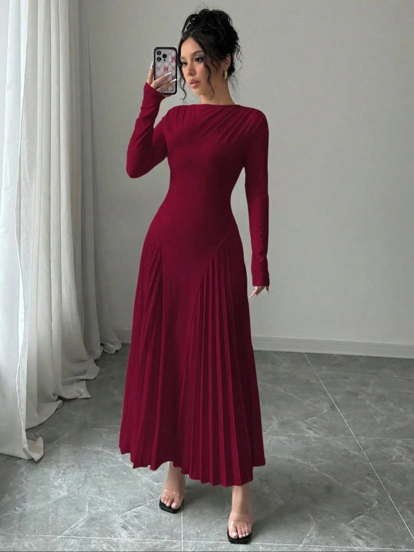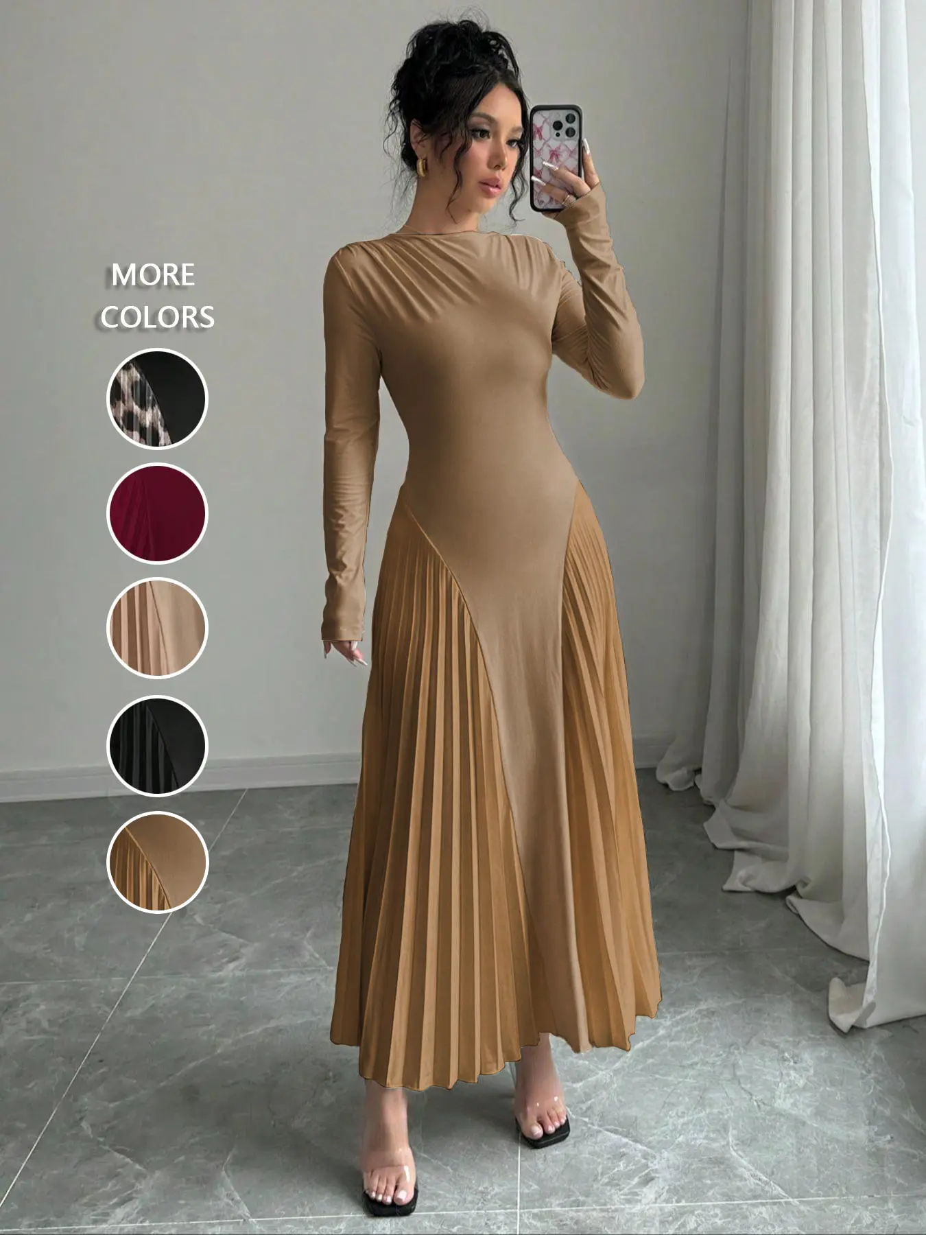 Beautiful dress and so comfortable! The wine red color is stunning. It was also warm which makes it a great fall/ winter event dress.