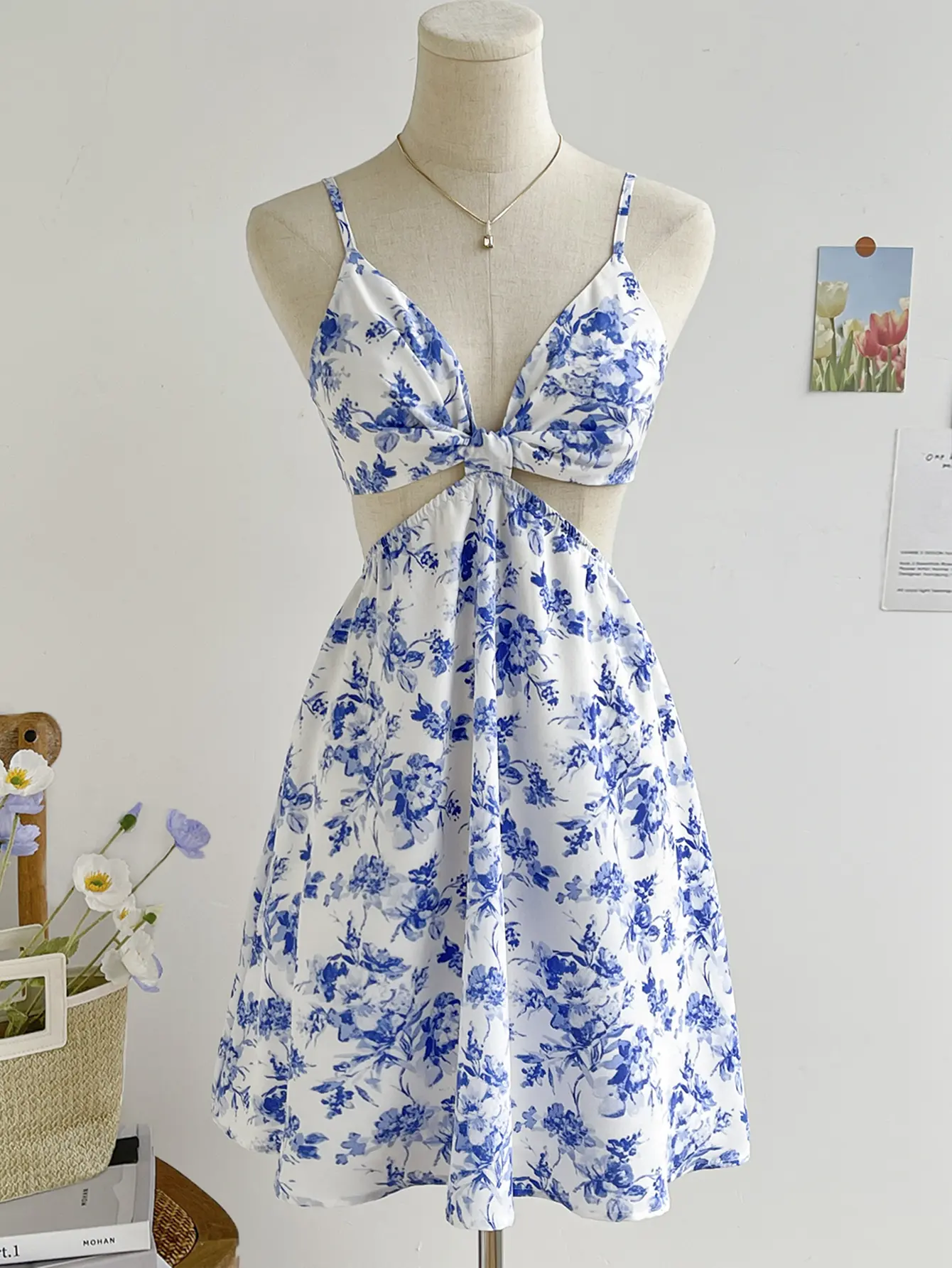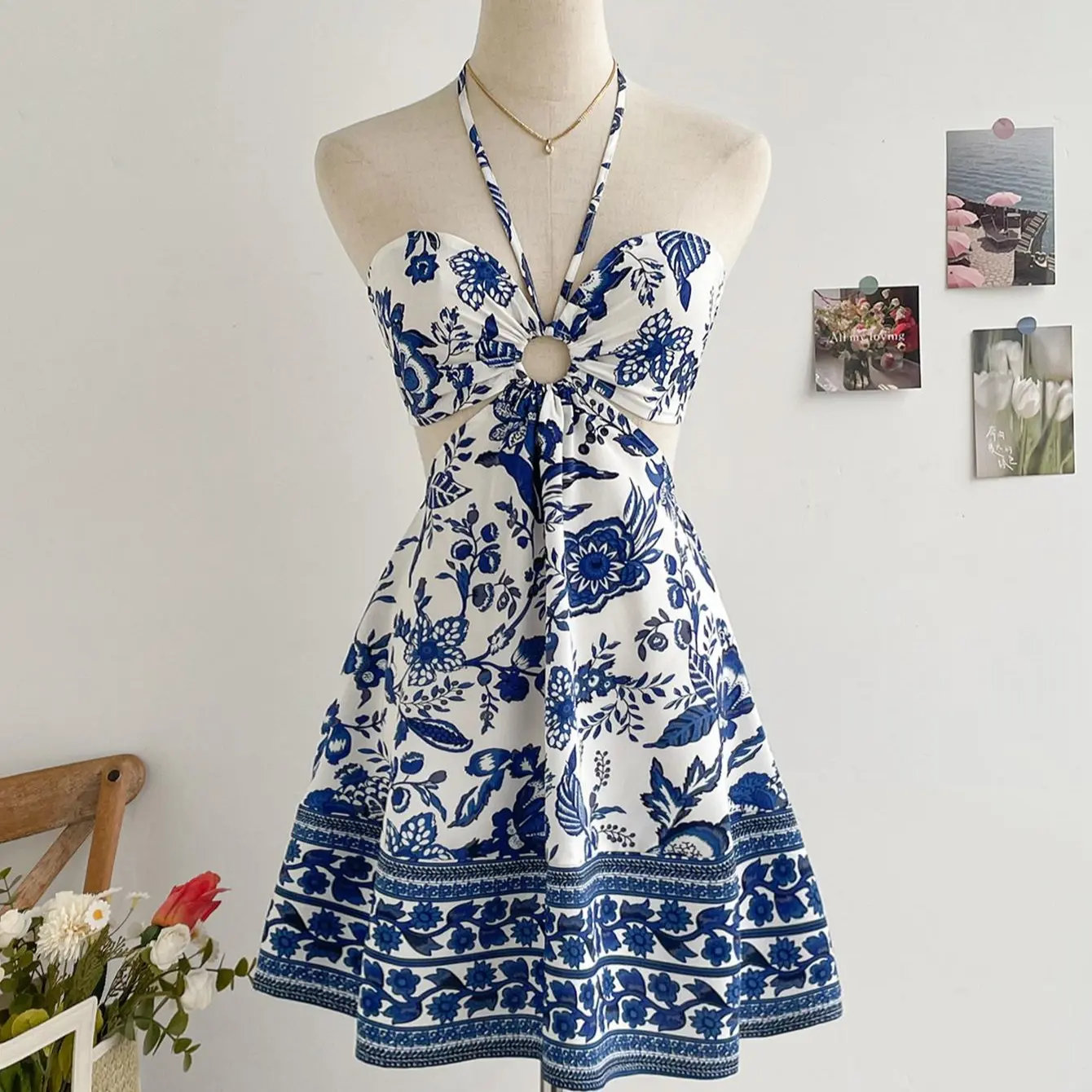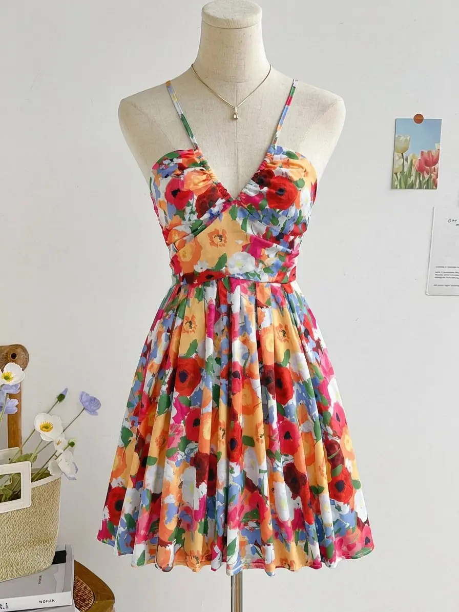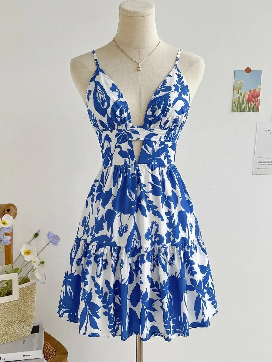 ·Features: Floral print, halter neck, hollow out, sleeveless, backless, cut out, high waist, all over print, o ring, smocked, casual short dress for women