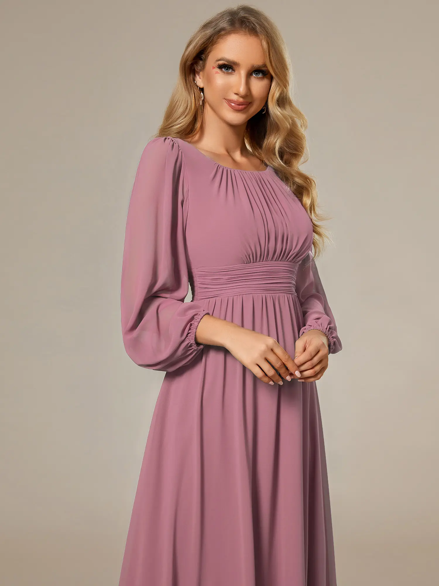 This romantic chiffon lantern sleeve Empire Waist Ruched mother of the bride dress leaves a lingering impression of elegance. Featuring sheer puffed long sleeves, a cinched empire waist, and flattering ruching, making it perfect for an outdoor wedding. The A-line floor-length silhouette can be paired with metallic, black, white, and nude heels.
