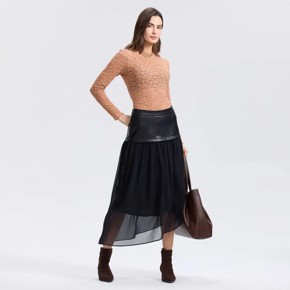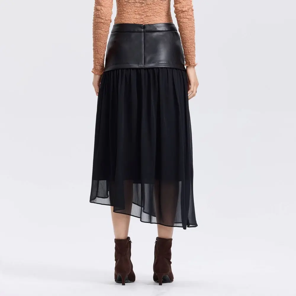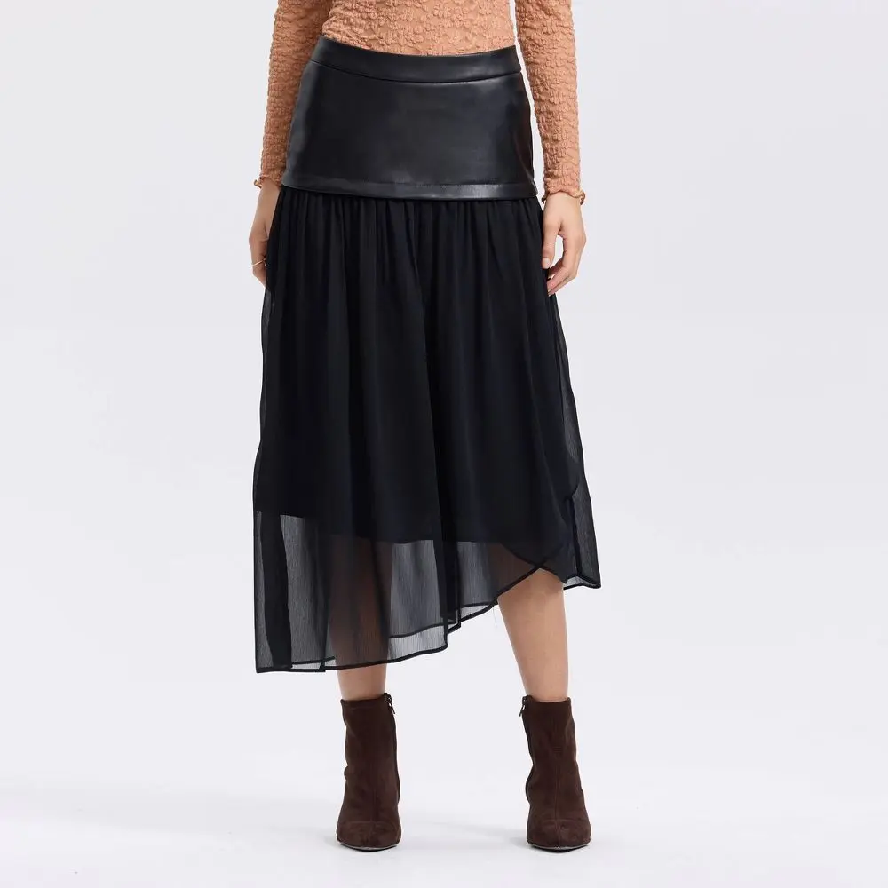 Make a modern statement with this fabric mixed skirt from A New Day. The PU and recycled chiffon blend offers textural contrast, while the asymmetrical hem adds dynamic movement. Style with simple tops to let the design shine through.