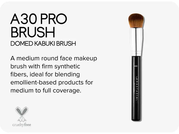 Anastasia Beverly Hills A30 Pro Brush - Domed Kabuki Brush is a medium round face makeup brush with firm synthetic fibers, ideal for blending emollient-based products for medium to full coverage on the face and body. The rounded dome shape of this professional makeup brush allows for easy application and blending on the face and body. With premium synthetic fibers, this pro artist blending brush is ideal for applying and buffing both liquid and cream foundation.